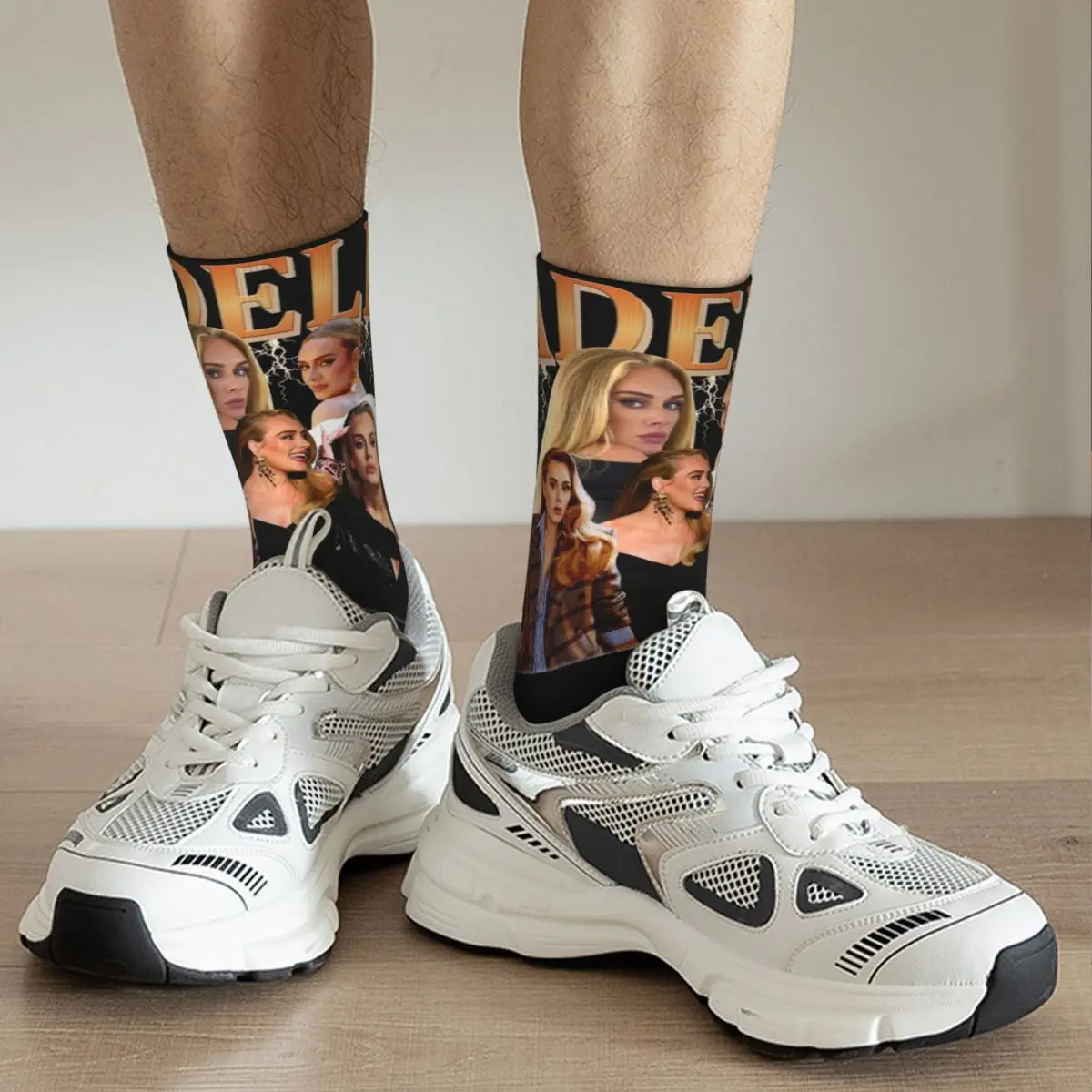 Show your love for Adele with these stunning limited edition socks featuring the pop icon herself! The design showcases multiple glamorous images of Adele against a striking black background with bold gold lettering at the cuff. These eye-catching socks combine edgy style with authentic fan appreciation, perfect for any devoted Adele supporter who wants to wear their admiration on their feet.