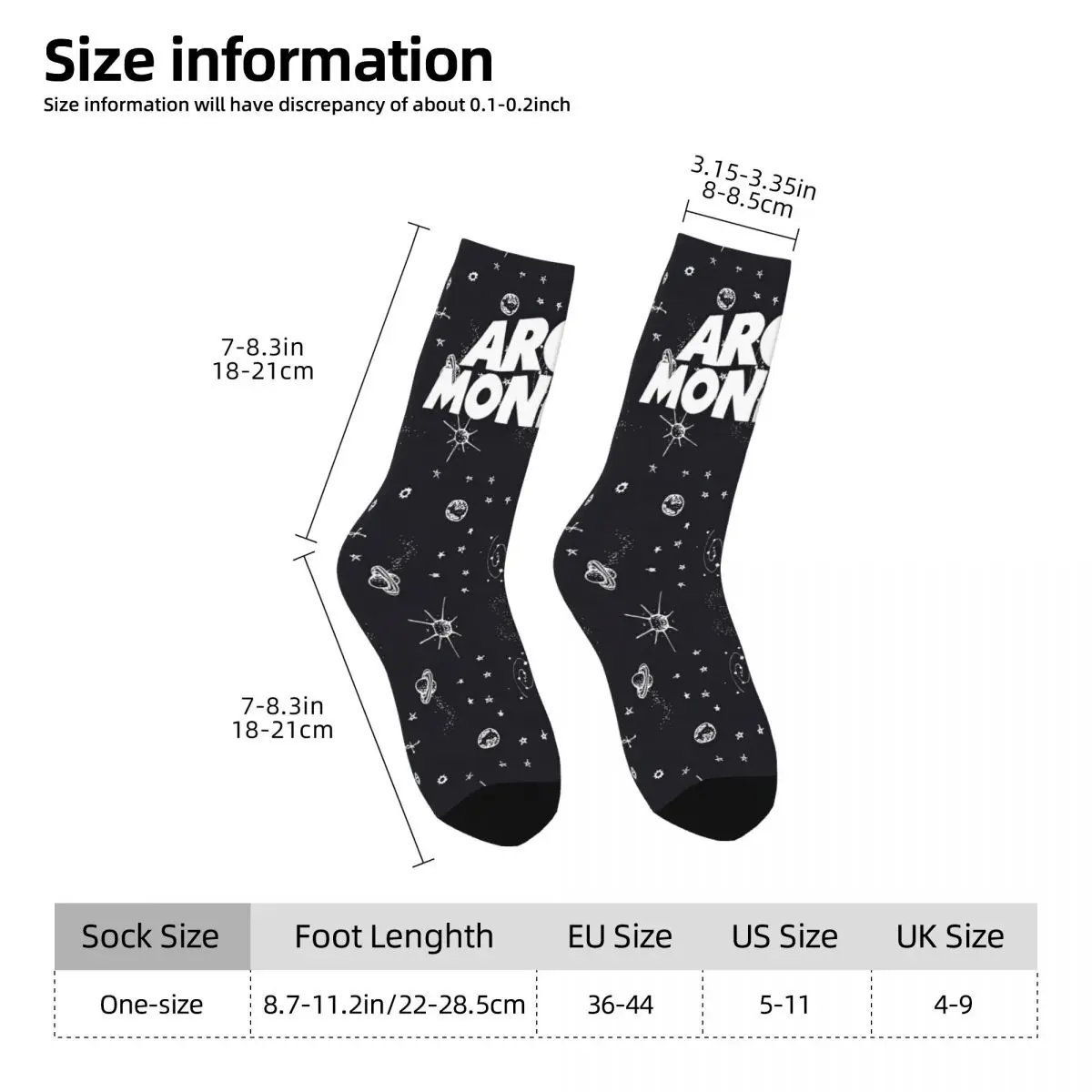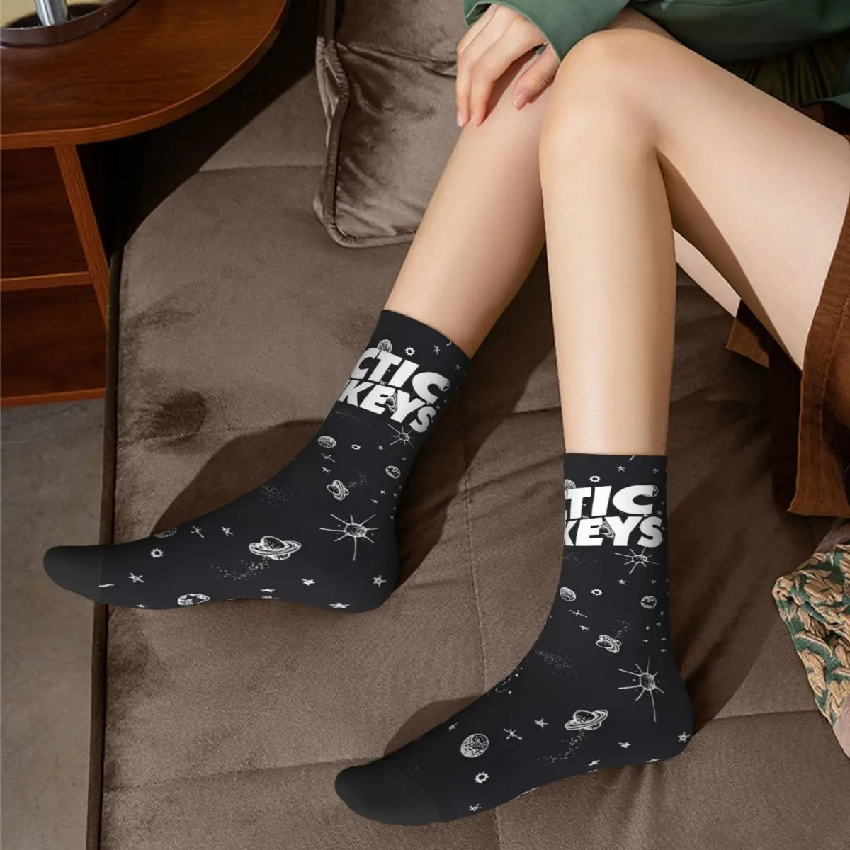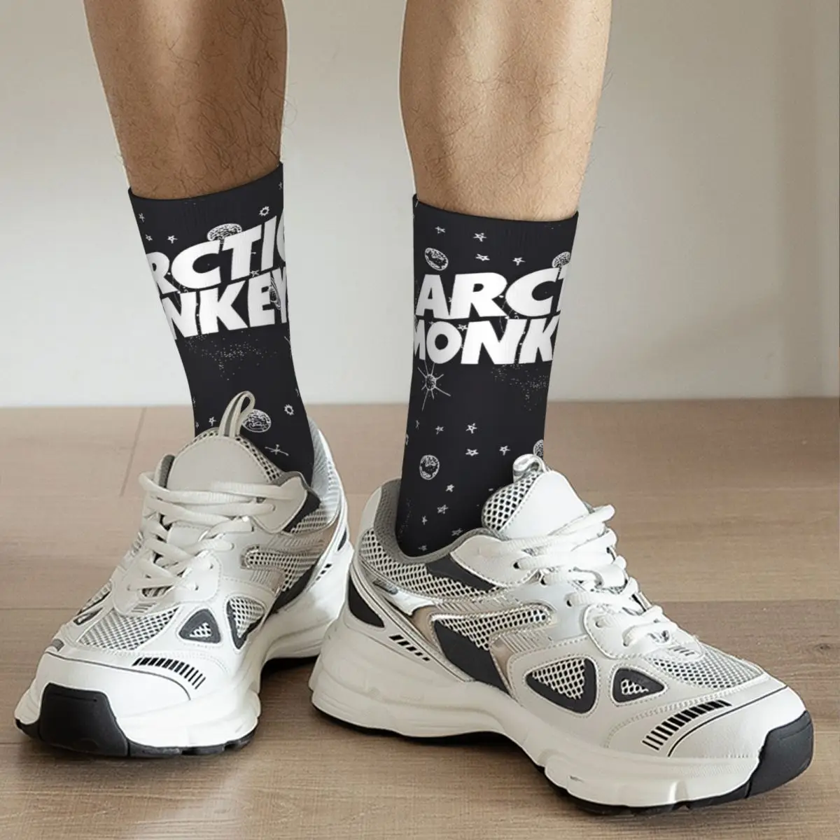 Rock your love for Arctic Monkeys with these cosmic socks that perfectly capture the band’s edgy aesthetic. Featuring bold “ARCTIC MONKEYS” text across the cuff, the design is scattered with celestial imagery—planets, stars, and suns rendered in white against a sleek black background. These socks are a stellar way to show your fandom while keeping your feet comfortable, combining the band’s artistic vision with everyday wearability that any true fan will appreciate.