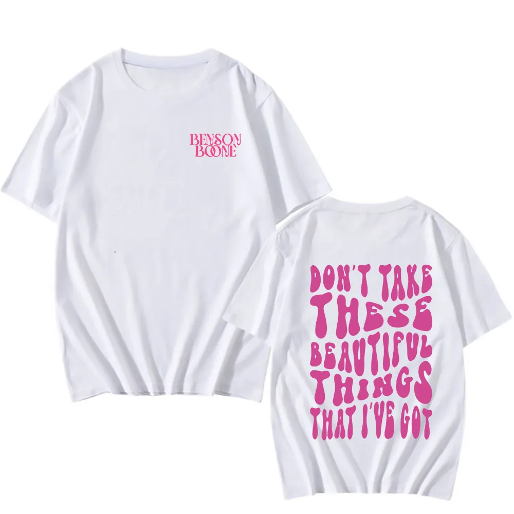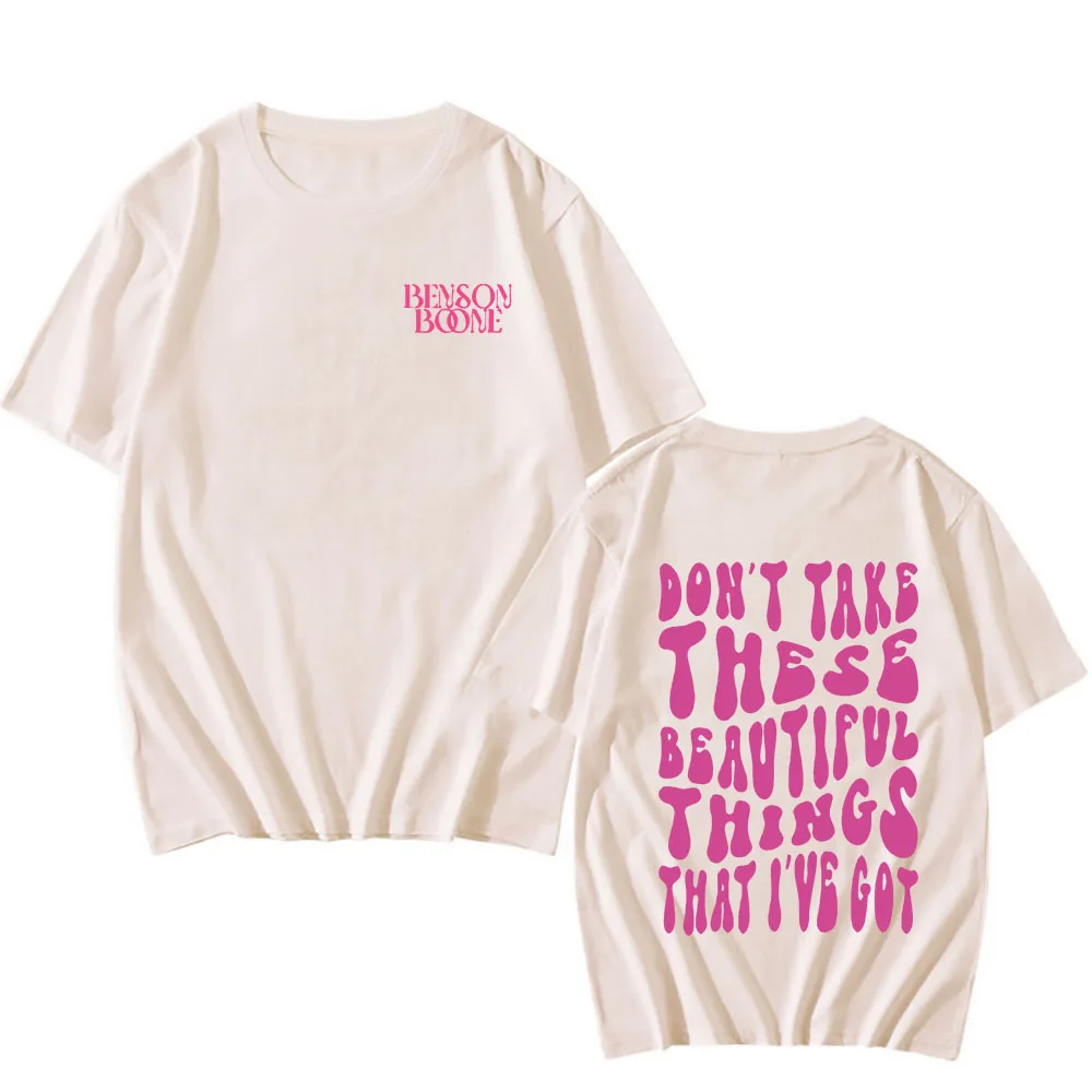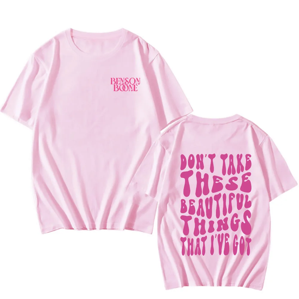 Rock the bold energy of Benson Boone with this stunning black t-shirt that features his iconic “Beautiful Things” design. The front displays the artist’s name in vibrant pink lettering, while the back showcases an eye-catching oversized graphic with the empowering message “Don’t Take These Beautiful Things That I’ve Got” in hot pink bubble letters. This is the perfect piece for fans who want to wear their love for Benson’s music with attitude and style.