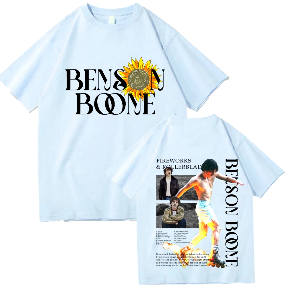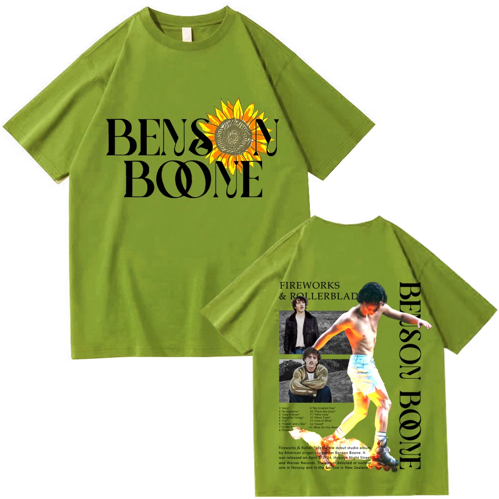 Rep Benson Boone in style with this stunning Fireworks & Rollerblades t-shirt! The front features bold white lettering with a vibrant sunflower graphic that perfectly captures the album’s aesthetic, while the back showcases album artwork with moody photos and fiery imagery. This oversized black tee is the ultimate way to celebrate Benson’s dynamic artistry and show your support for one of pop’s most exciting voices.