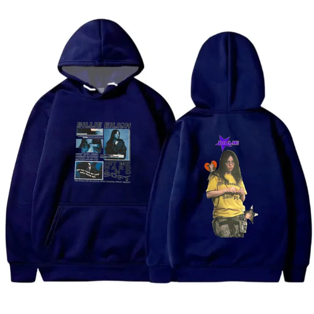 Rock the moody aesthetic of Billie Eilish with this striking New Album Aesthetic Hoodie. The front features a cool blue-tinted collage design with iconic imagery, while the back showcases a bold portrait of Billie in a vibrant yellow top with purple neon text overlay. This black hoodie perfectly captures her edgy, modern style and is a must-have for any devoted fan.