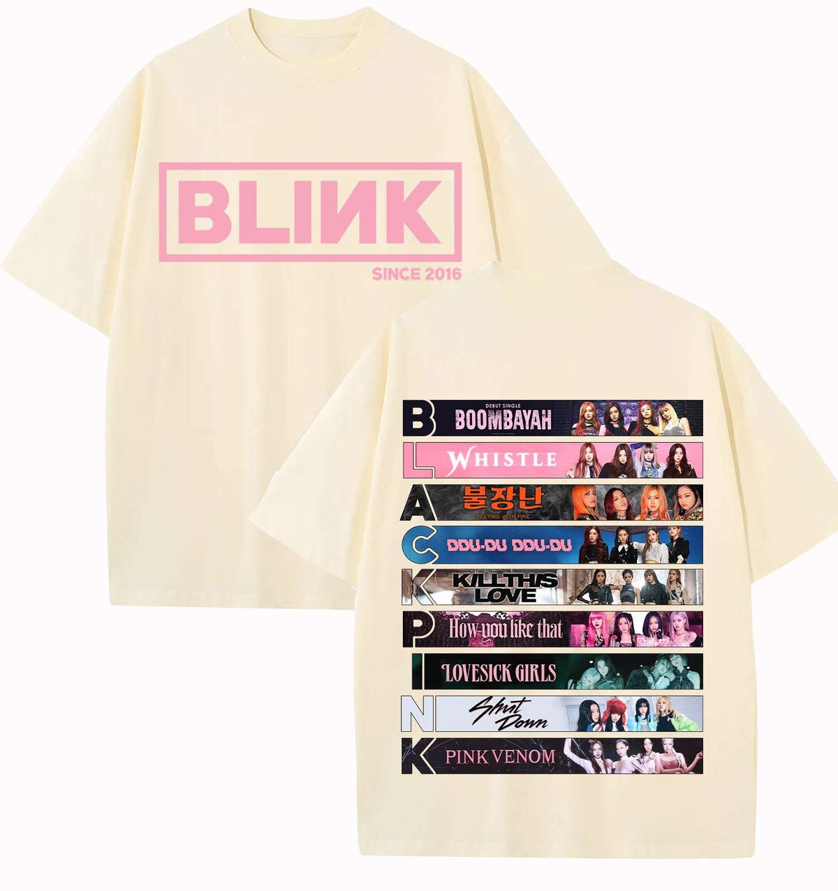 Show your BLINK pride with this iconic BLACKPINK Since 2016 tee that celebrates the group’s greatest hits! The front features the unmistakable pink BLINK logo with the founding year, while the back showcases a stunning discography lineup including Boombayah, Whistle, DDU-DU DDU-DU, Kill This Love, How You Like That, Lovesick Girls, Shut Down, and Pink Venom. This is the ultimate must-have for any dedicated BLACKPINK fan who wants to rep their favorite K-pop legends.