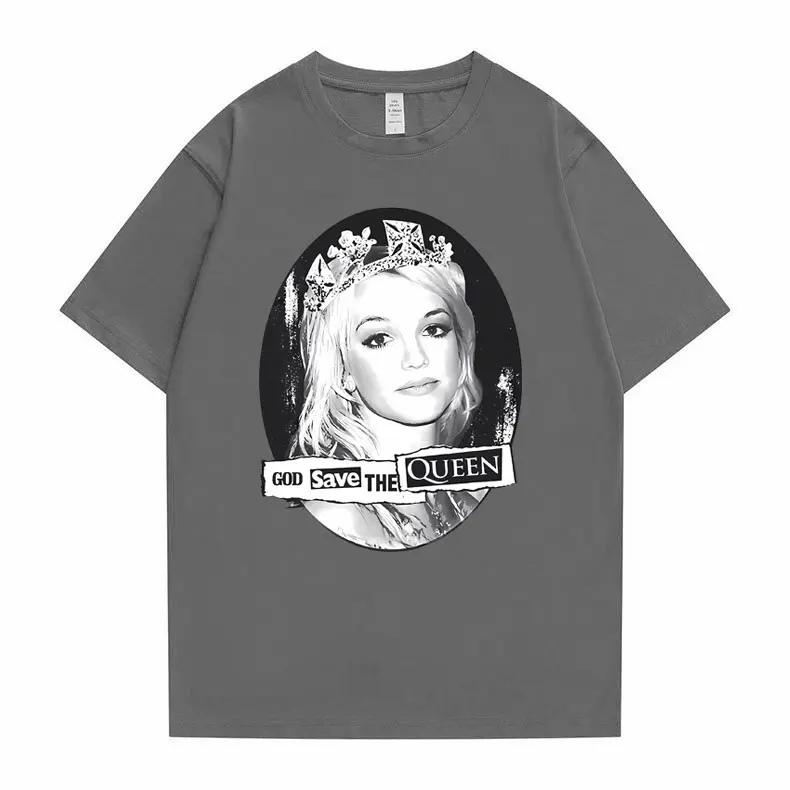 This striking black tee features a bold black and white portrait of Britney Spears wearing an ornate crown, with the iconic “God Save The Queen” text banner across the chest. The high-contrast design gives it that classic punk-inspired aesthetic while celebrating one of pop’s biggest icons. It’s the perfect statement piece for anyone who loves Britney and wants to rep her legacy with style.