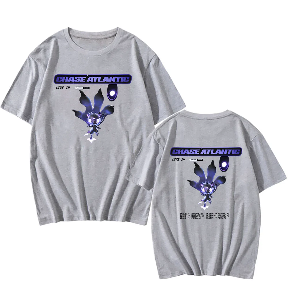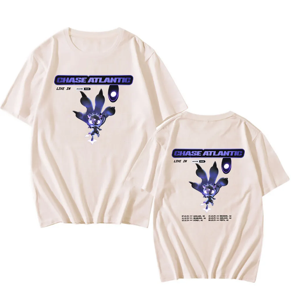 Rep Chase Atlantic with this stunning Lost In Heaven tour tee featuring their iconic purple mascot character in all its glory. The front displays the bold ‘CHASE ATLANTIC’ logo with ‘LIVE IN’ text and tour details, while the back includes the complete tour dates in true concert merchandise style. Printed on crisp white cotton, this is the ultimate piece for any fan of the band’s moody, atmospheric pop sound.