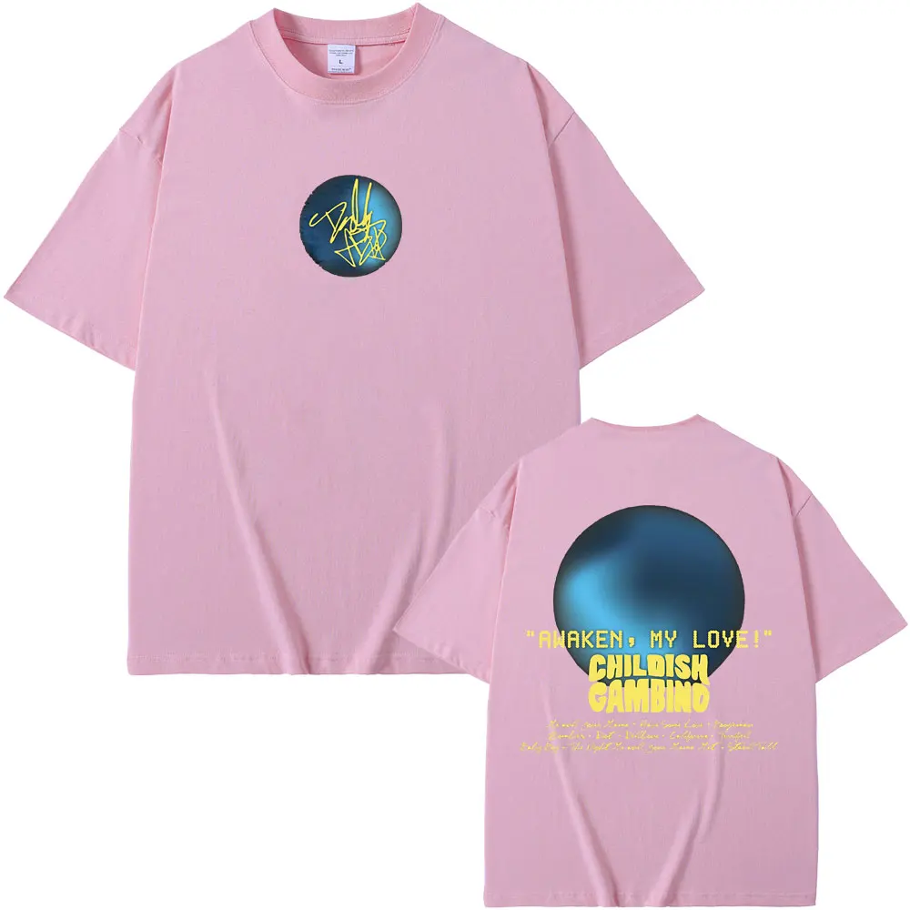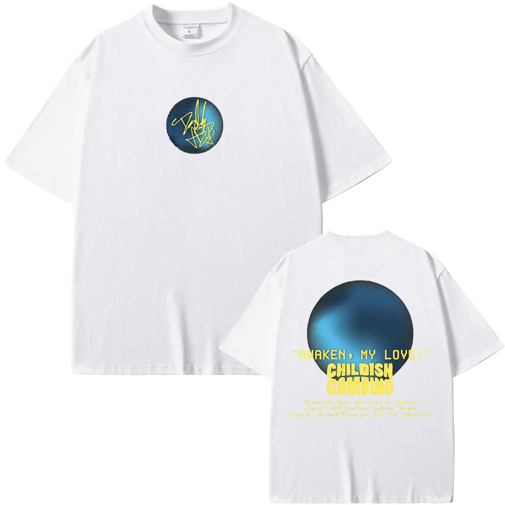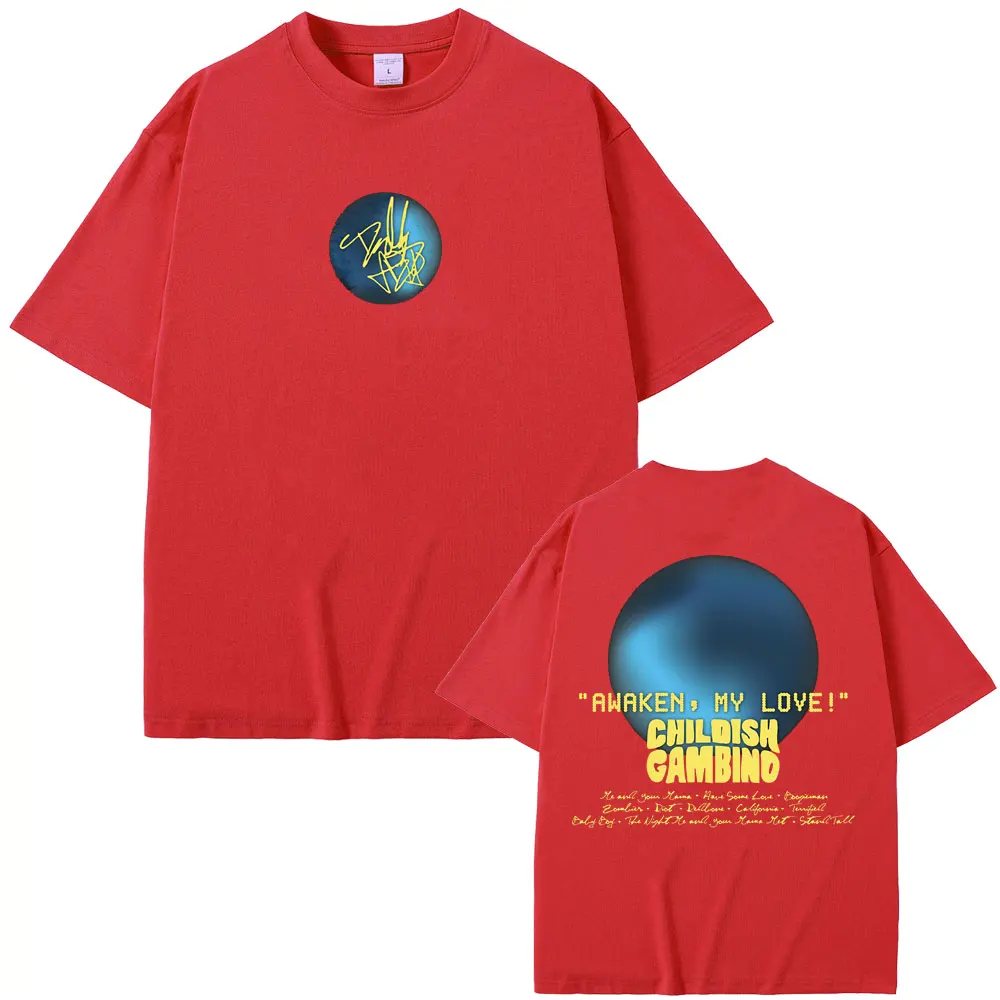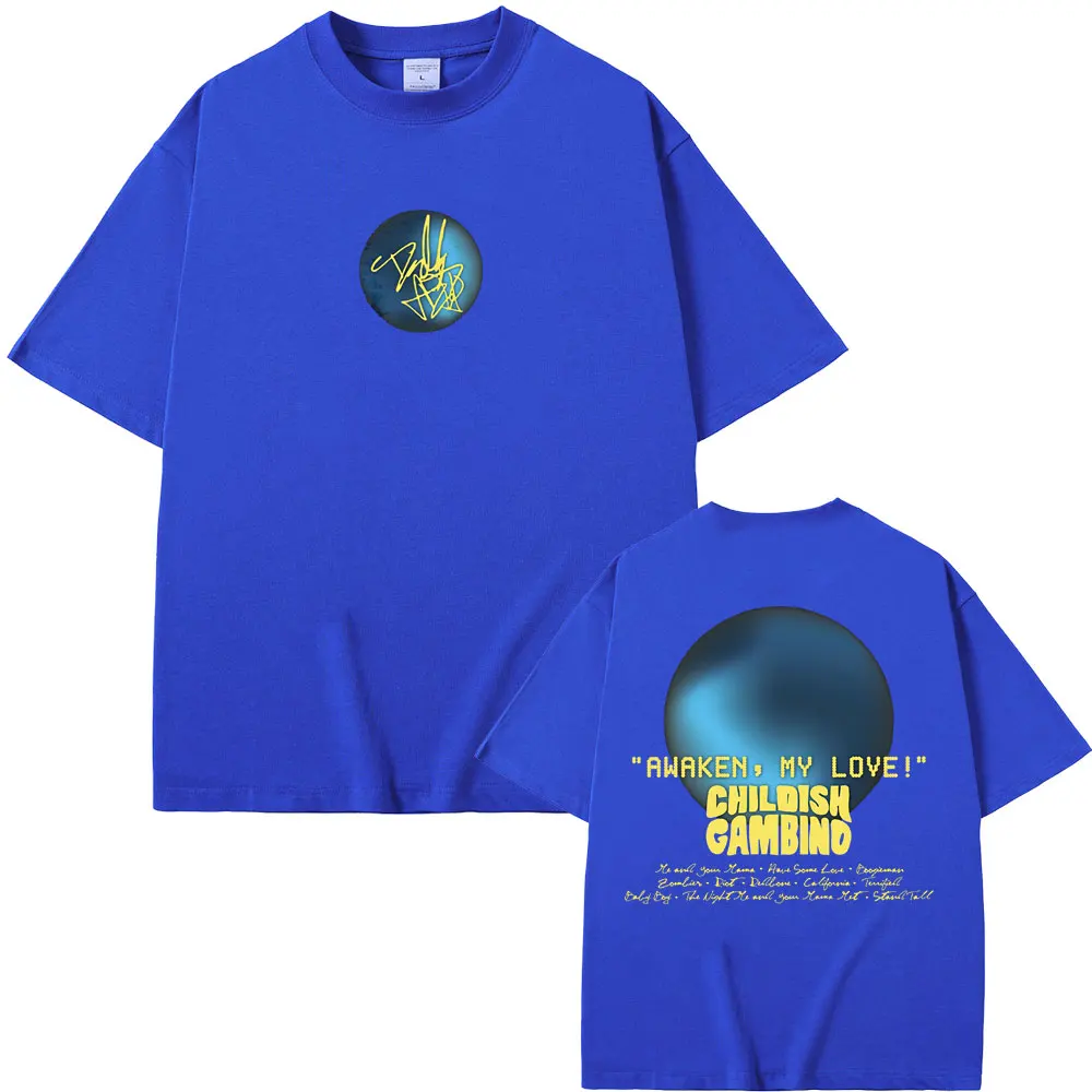 Rock the iconic artwork from Childish Gambino’s “Awaken, My Love!” with this stunning oversized tee. The front features a mesmerizing blue circular design with golden yellow abstract lines, while the back displays the album title in bold retro lettering alongside a glowing orb. This is the perfect piece for fans who want to celebrate one of hip-hop’s most innovative albums in style.