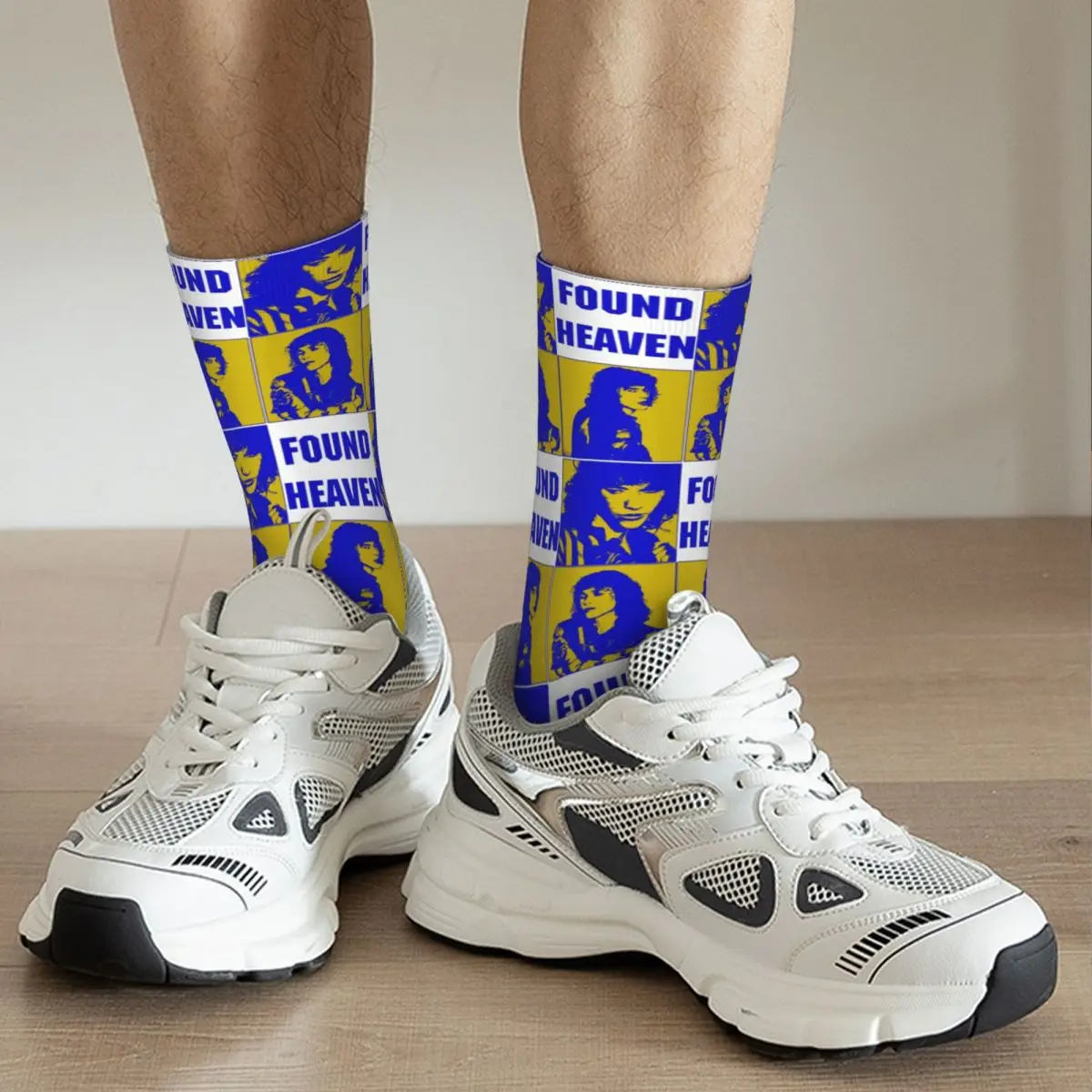 Rock your love for Conan Gray with these bold blue and yellow socks featuring the iconic “Found Heaven” design! The all-over pop art style showcases vibrant portrait blocks in contrasting royal blue and mustard yellow, with white banner text wrapping around the sock. With a classic black heel and toe for durability, these statement socks are perfect for showing off your dedication to Conan’s music while keeping your feet comfy and stylish.