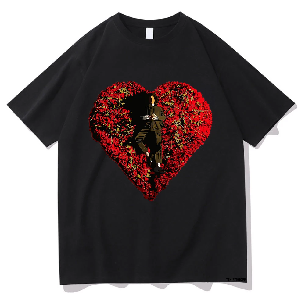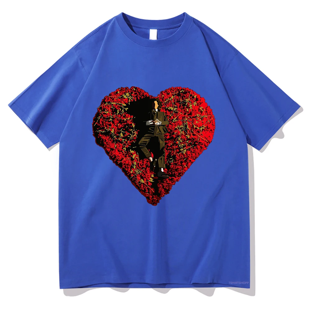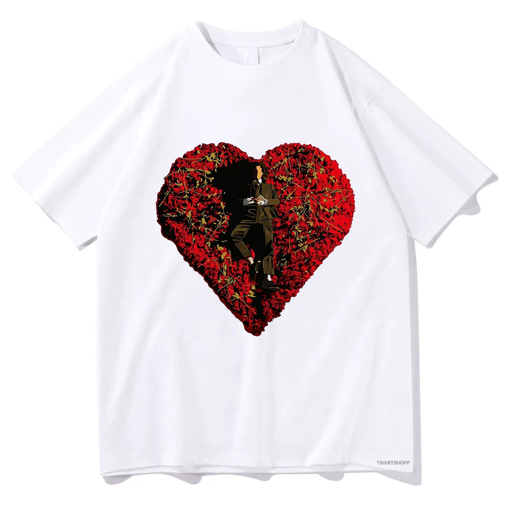 This stunning Conan Gray tee features a mesmerizing heart-shaped design bursting with vibrant red flowers, creating a romantic and artistic centerpiece on a classic cream-colored shirt. The silhouette of Conan Gray emerges beautifully within the floral heart, blending his image seamlessly with the botanical aesthetic. It’s the perfect way to celebrate your love for his music while wearing wearable art that captures the emotional depth of his artistry. This design is an absolute must-have for any devoted fan looking to make a statement.