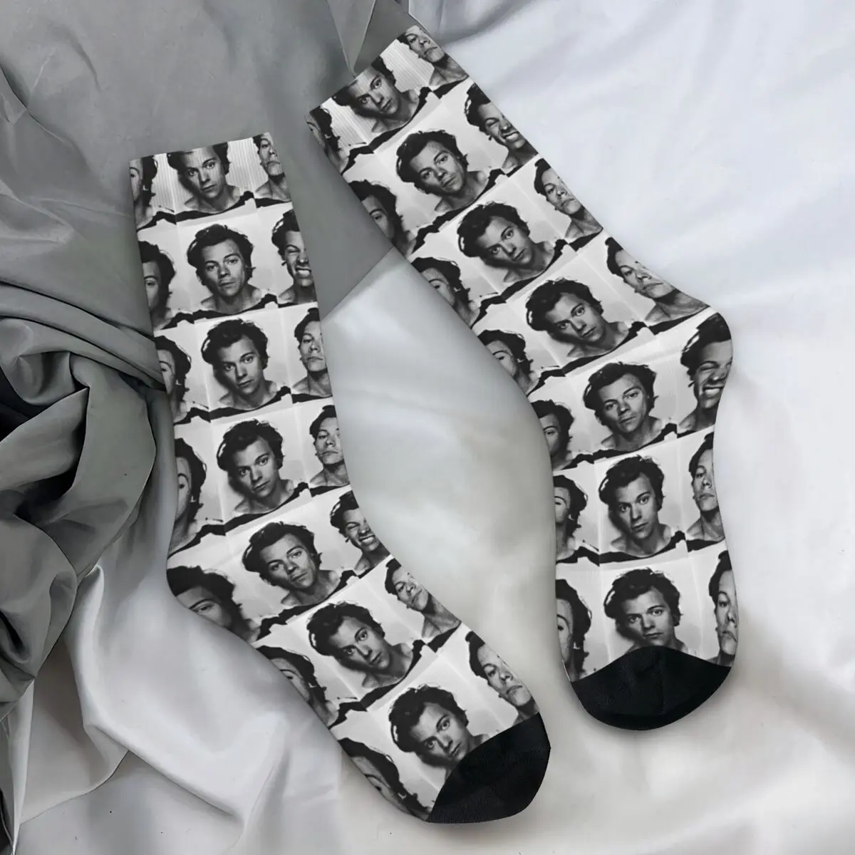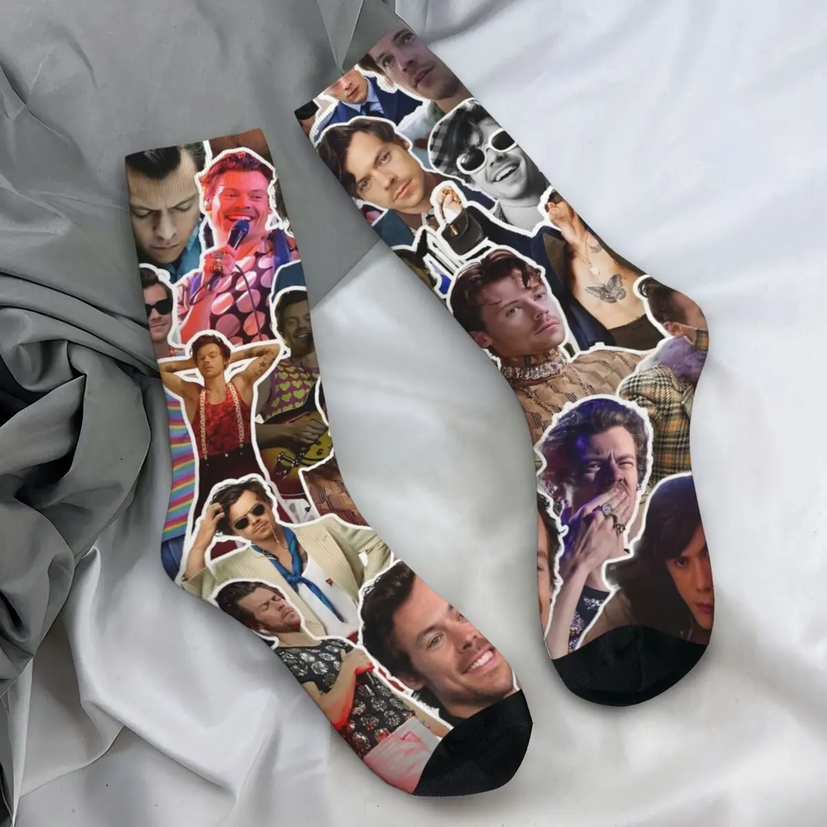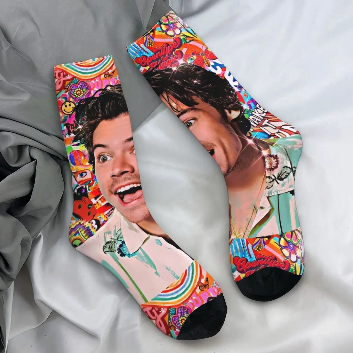 These vibrant Harry Styles fan socks are an absolute must-have for any devoted admirer! The design features a colorful collage of iconic Harry moments across the decades, with his smiling face repeating throughout in various outfits and eras. The mix of bold colors—from rich blacks and pinks to soft blues and yellows—creates an eye-catching pattern that celebrates every stage of his career. With cozy black accents at the heel and toe, these socks are as comfortable as they are collectible.