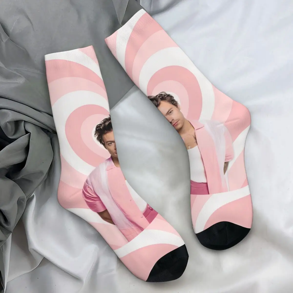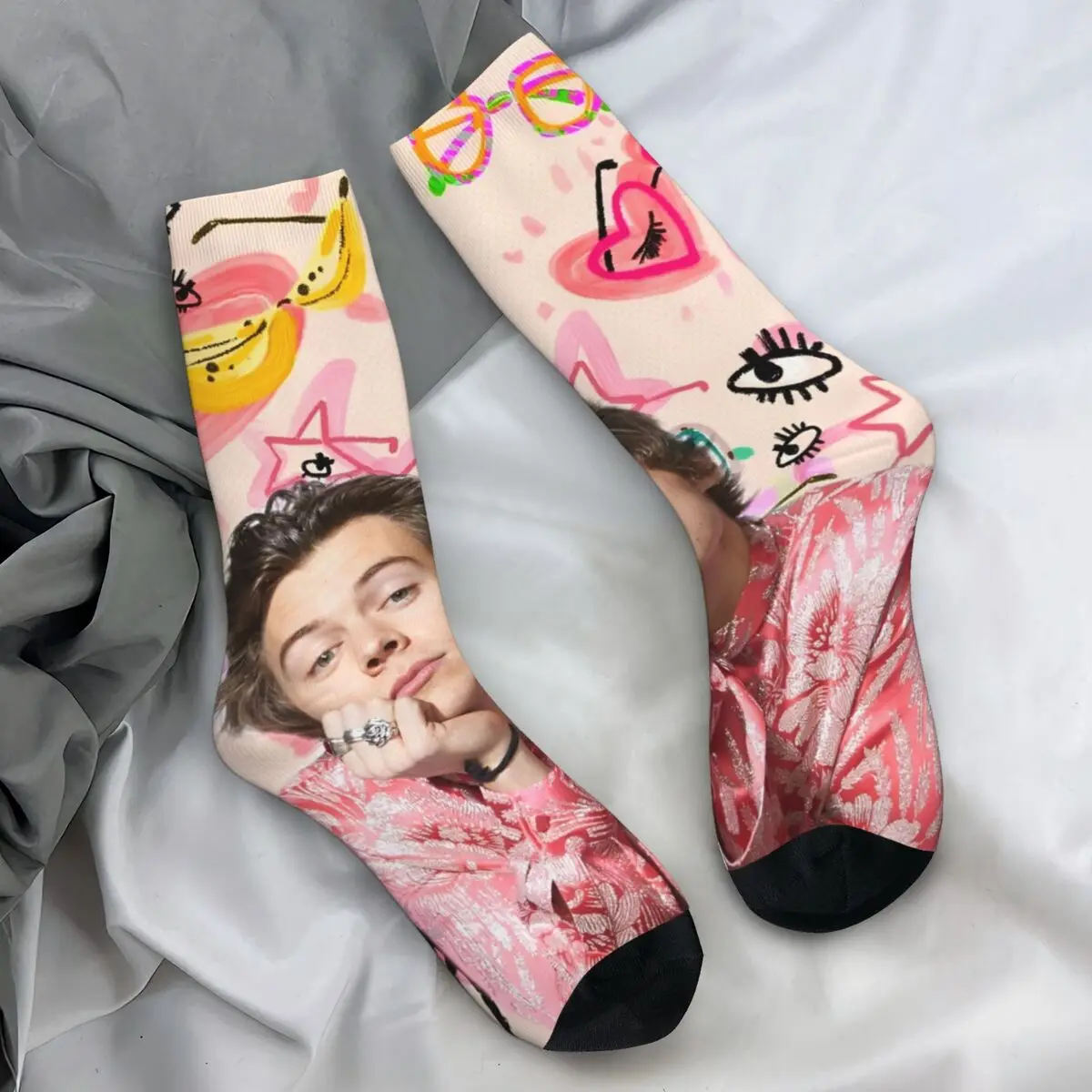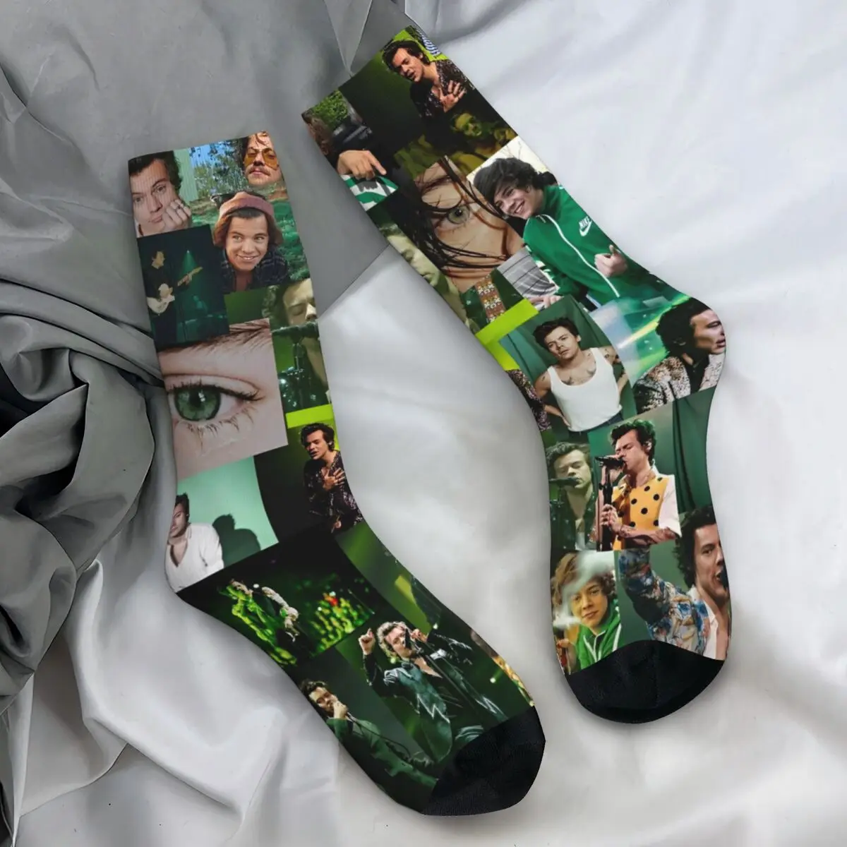 These vibrant Harry Styles fan socks are an absolute must-have for any devoted admirer! The design features a colorful collage of iconic Harry moments across the decades, with his smiling face repeating throughout in various outfits and eras. The mix of bold colors—from rich blacks and pinks to soft blues and yellows—creates an eye-catching pattern that celebrates every stage of his career. With cozy black accents at the heel and toe, these socks are as comfortable as they are collectible.