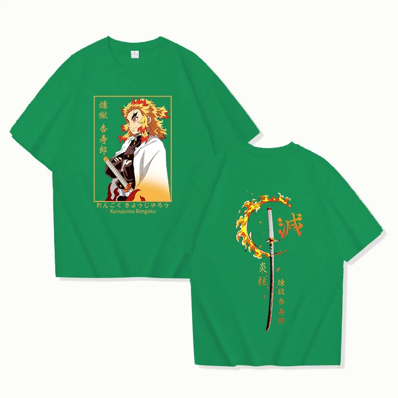 Bring the fierce energy of the Flame Hashira to your wardrobe with this stunning Rengoku Kyojuro t-shirt! The front features an incredible portrait of Rengoku with his iconic bright yellow flame-like hair, framed by Japanese characters and his signature determined expression. Flip it around and you’ll see an equally epic back design with his Flame Breathing symbol surrounded by fiery detail and vertical Japanese text. This double-sided design captures everything fans love about one of Demon Slayer’s most beloved characters.