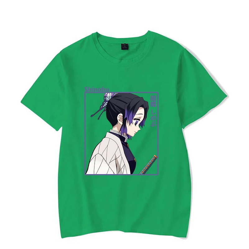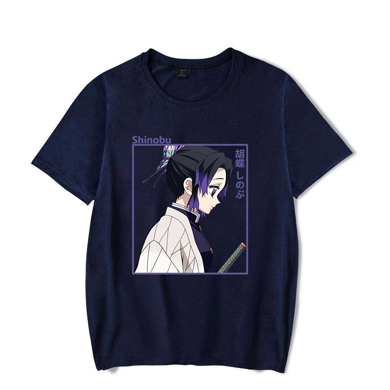 Showcase your love for the Demon Slayer series with this stunning Shinobu Kochō front print t-shirt! The design captures the Insect Hashira in her signature white and purple outfit, rendered in beautiful anime art style with Japanese characters framing her graceful profile. The sleek black tee serves as the perfect canvas for this eye-catching purple-bordered graphic that anime fans will instantly recognize and adore.