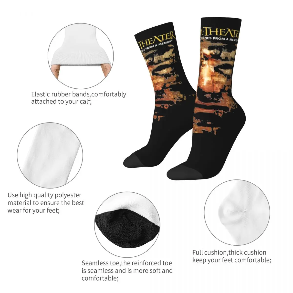 Rock your collection with these stunning Dream Theater socks featuring the iconic artwork from ‘Scenes From a Memory.’ The striking design combines bold gold lettering against a dramatic black background, with ethereal imagery that captures the prog metal essence of the album. Perfect for any Dream Theater devotee who wants to showcase their love for one of metal’s most conceptually ambitious masterpieces in everyday style.