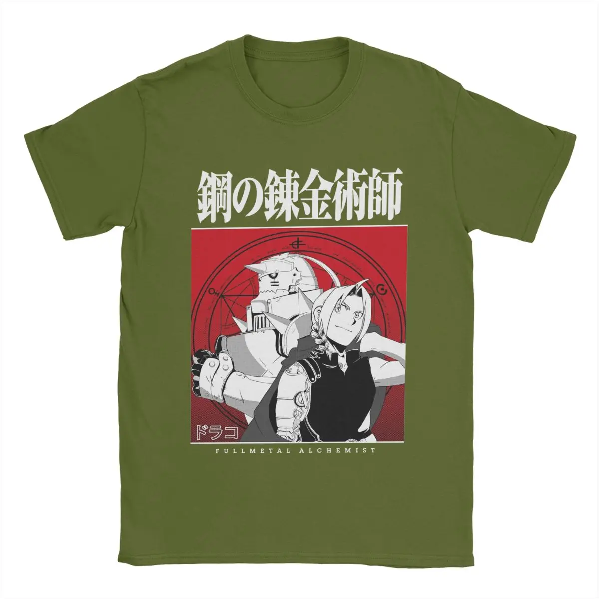 This striking Fullmetal Alchemist tee showcases the iconic Elric brothers in stunning black and white illustration against a bold red circular alchemical background. Edward’s mechanical arm is front and center, while Alphonse towers behind in his imposing armor, perfectly capturing the essence of their unforgettable journey. The Japanese title 鋼の錬金術師 (Fullmetal Alchemist) dominates the top, making this an essential piece for any devoted fan of this legendary series.
