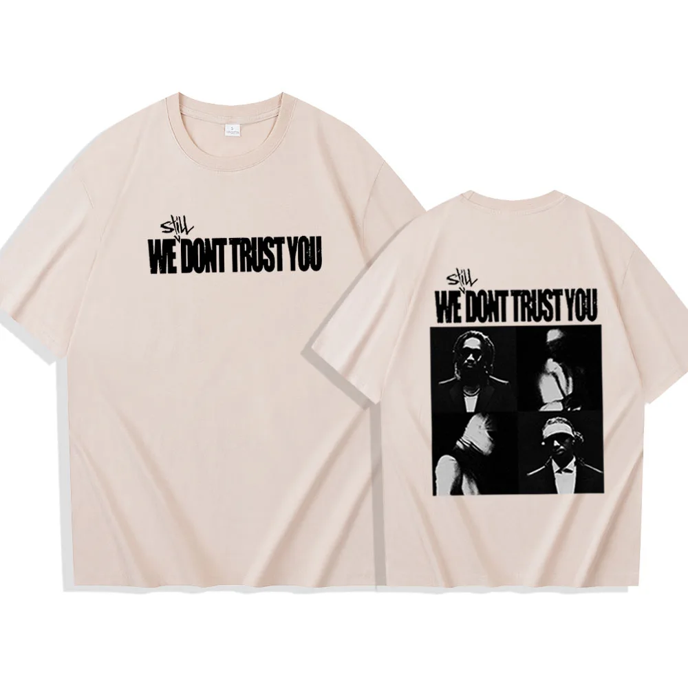 Rock the iconic “We Don’t Trust You” design with this bold Future & Metro Boomin collab tee. The front features the clean, hard-hitting text that’s become a statement piece for hip-hop fans, while the back showcases striking black-and-white imagery of the legendary duo. This oversized fit pairs perfectly with the minimalist aesthetic, giving you that authentic streetwear vibe that celebrates one of the hottest albums in rap.