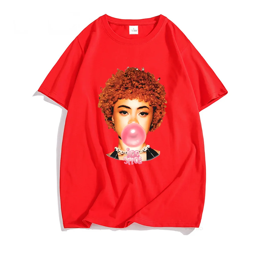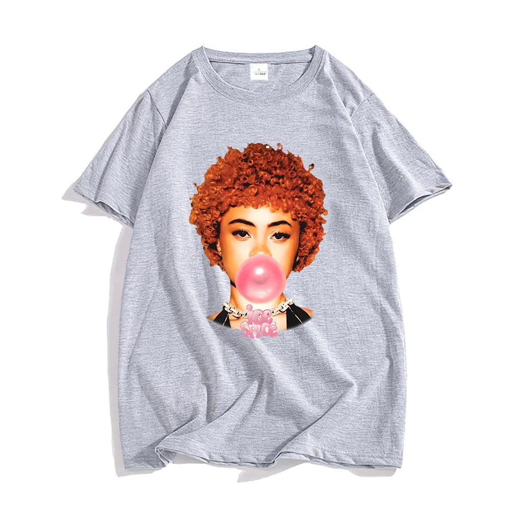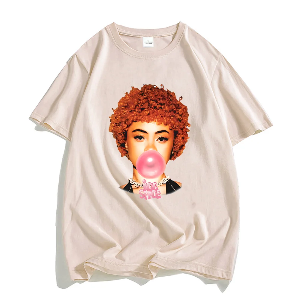 This Ice Spice tee is an absolute must-have for fans of the Bronx rap icon! The design features a bold pop art portrait of Ice Spice with her signature fiery red curls, striking makeup, and a huge pink bubble gum bubble taking center stage. The white tee showcases the playful "Spice" text with a chain necklace detail, perfectly capturing her fun and confident energy. It’s the kind of statement piece that shows off your devotion to one of hip-hop’s hottest artists.
