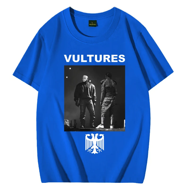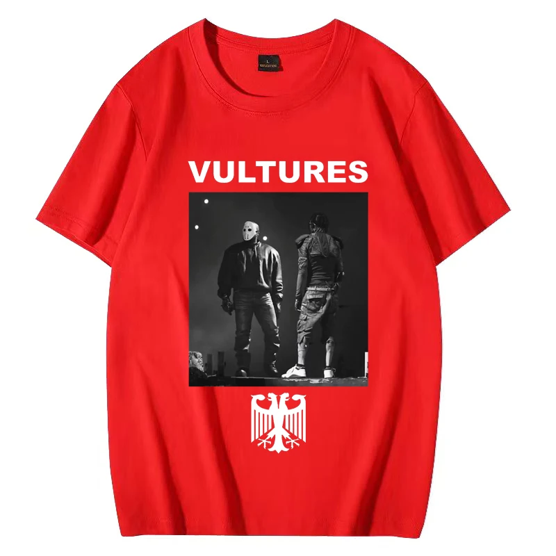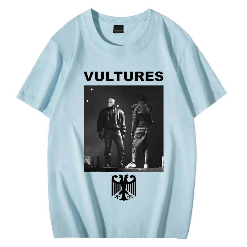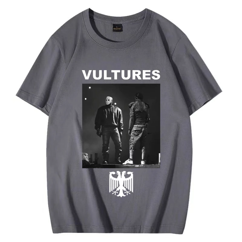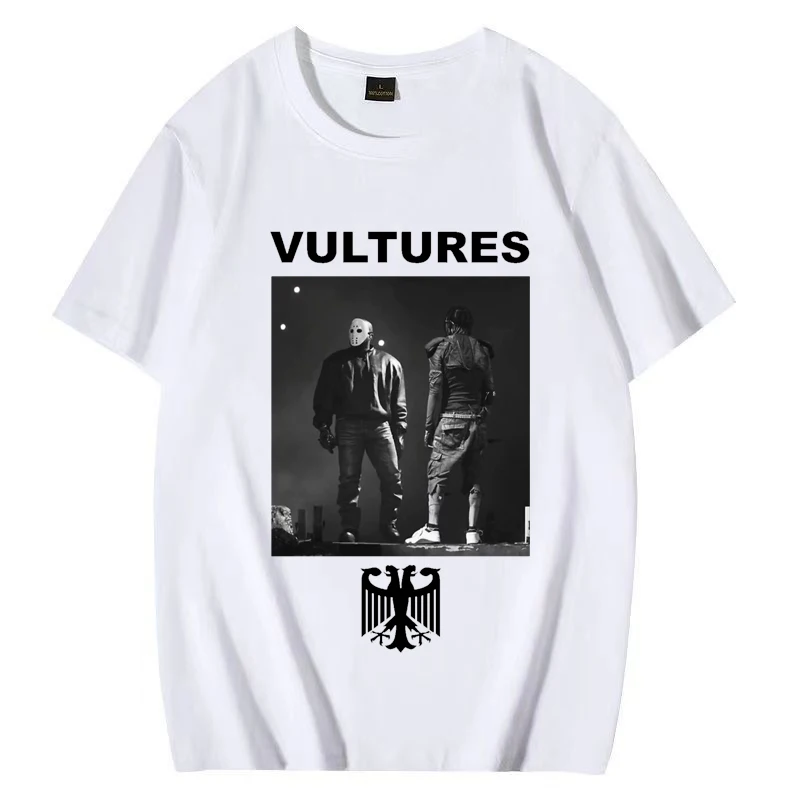 This striking Kanye West Vultures tee captures the iconic album artwork in bold black and white on a classic black shirt. The design features the album title in crisp white lettering at the top, with a dramatic monochrome photograph of two figures below, and the distinctive eagle emblem anchoring the composition. It’s the perfect way to rep one of hip-hop’s most talked-about releases and show your appreciation for Ye’s artistic vision.
