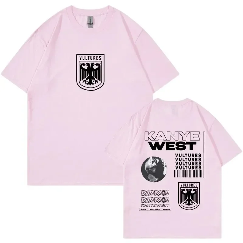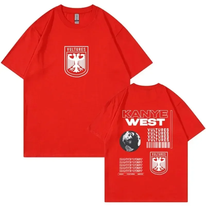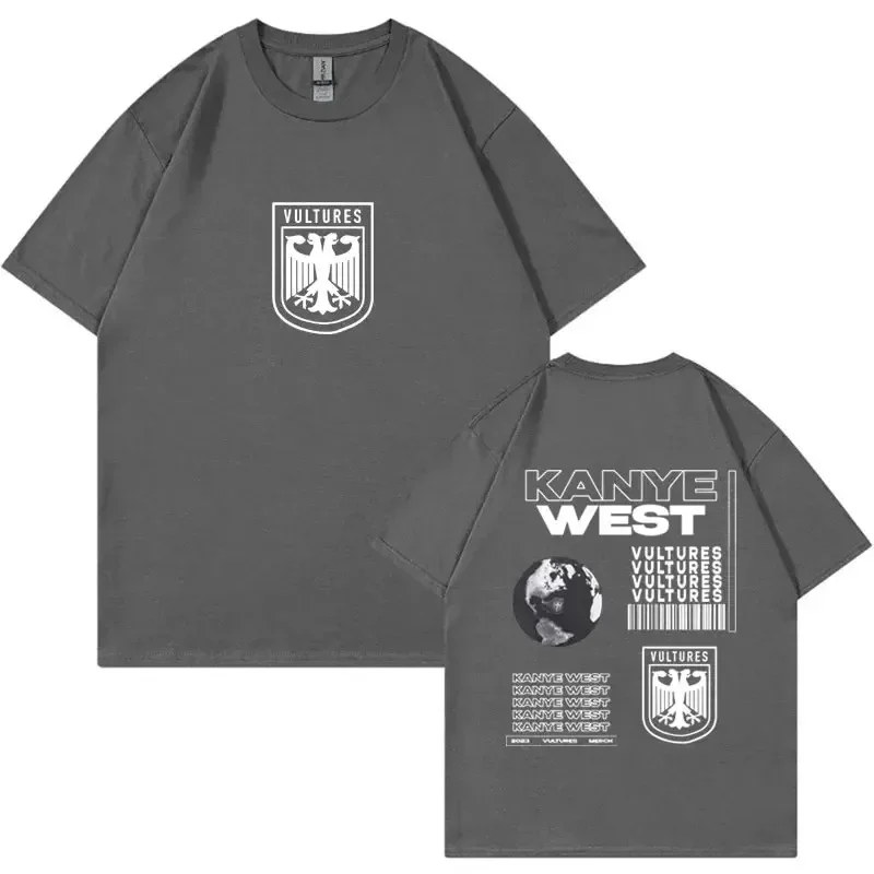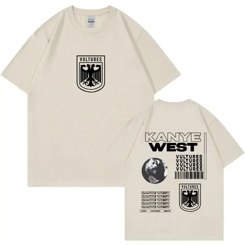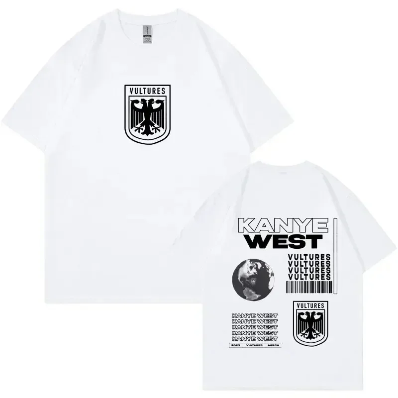 Rock the iconic Vultures album aesthetic with this bold black tee featuring Kanye West’s signature design language. The front displays a striking heraldic eagle shield emblem in white, while the back showcases the full Vultures artwork with the globe, repeated text graphics, and barcode elements that define the album’s visual identity. This is the ultimate piece for fans who want to represent one of hip-hop’s most talked-about projects with authentic, album-inspired style.