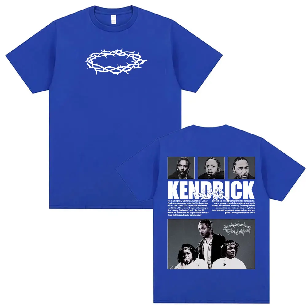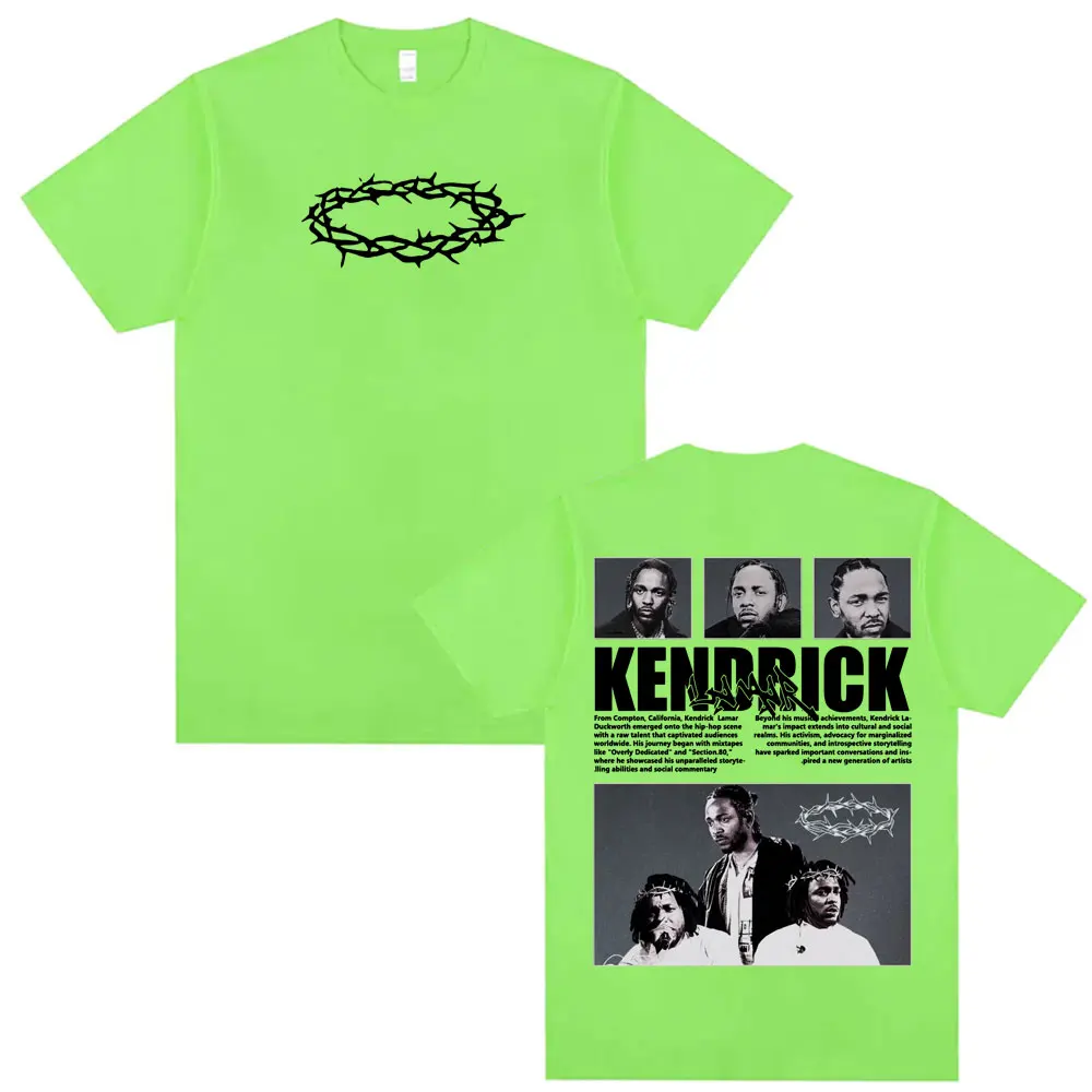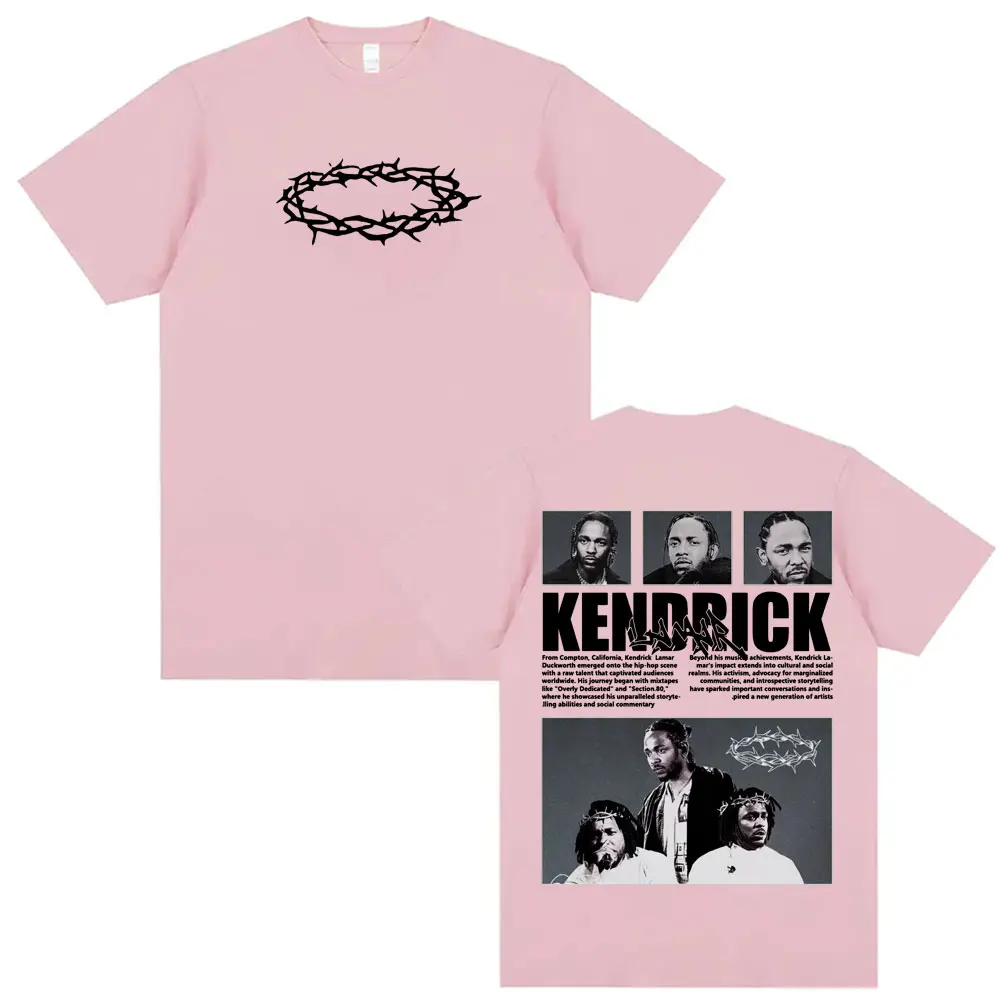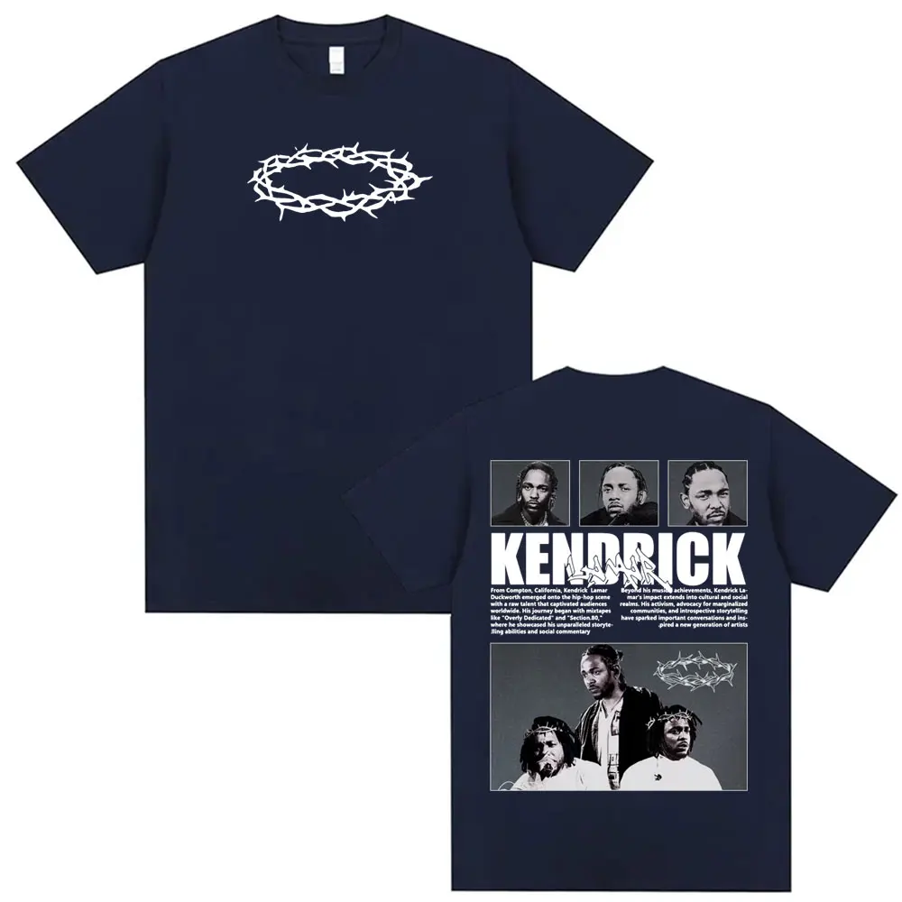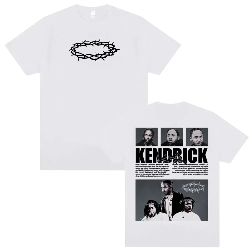 This striking Kendrick Lamar Crown Album Print T-shirt features a clean, minimalist front design with an iconic thorn crown graphic that instantly resonates with fans of the legendary rapper. The back showcases a powerful collage of portrait photography and biographical text, celebrating Kendrick’s influence and impact on hip-hop culture. The classic black tee serves as the perfect canvas for this bold, artistic tribute that any true fan will recognize and appreciate.