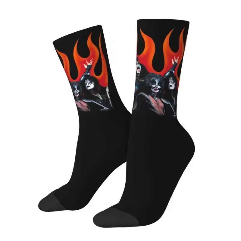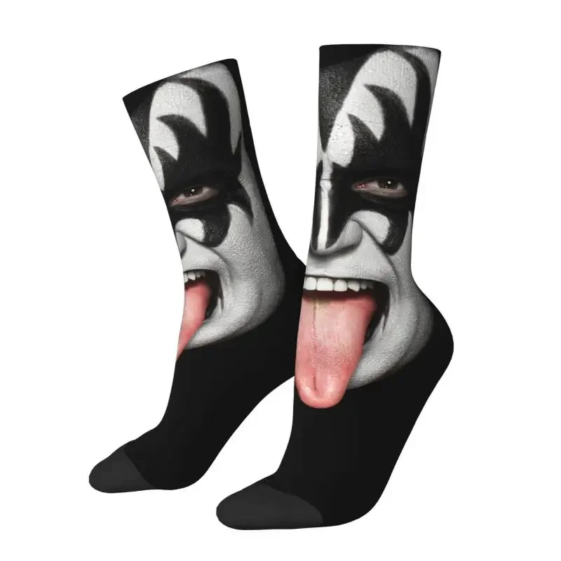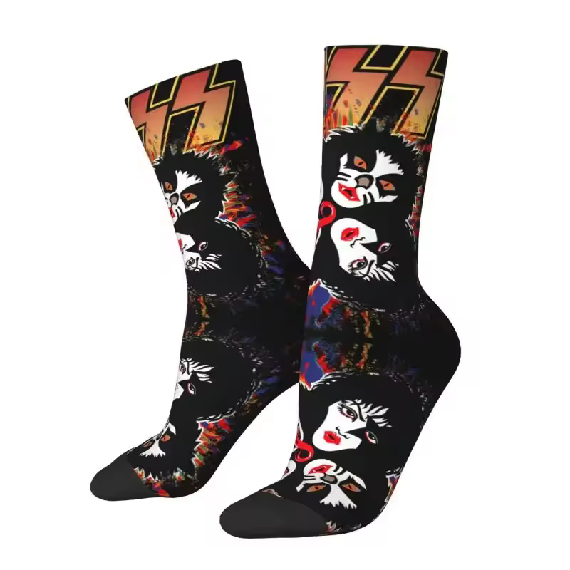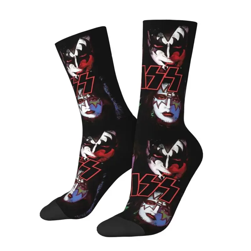 Rock out with these iconic Kiss socks featuring the legendary band’s legendary face paint designs in vibrant detail. The all-black socks showcase each member’s instantly recognizable makeup in bold colors—red, white, and neon accents—that pop against the dark backdrop. Perfect for any Kiss devotee who wants to wear their band pride from head to toe, these socks capture the theatrical essence and raw energy that made Kiss a global phenomenon.