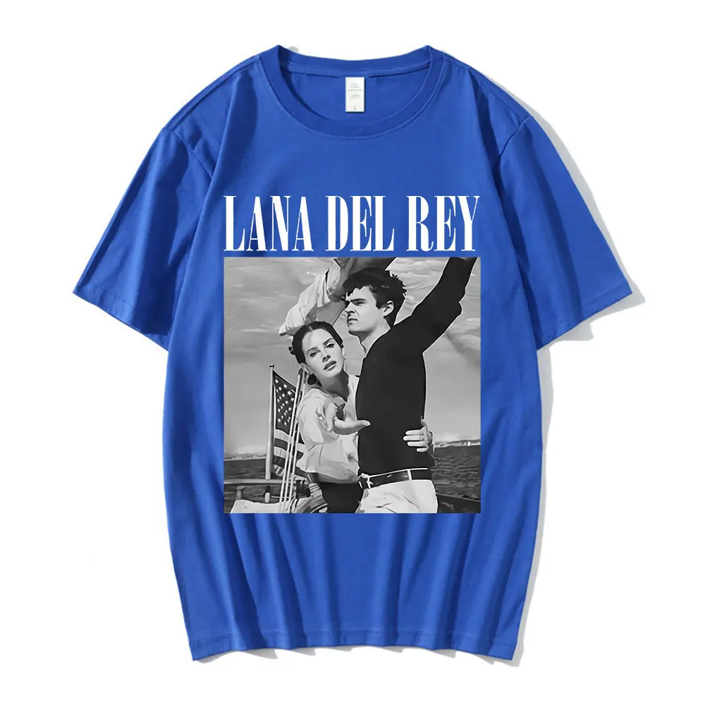 This stunning Lana Del Rey Sailing T-shirt captures the cinematic elegance that defines her aesthetic. The black tee features a striking black-and-white vintage-inspired image of the artist with a figure on a boat, complete with an American flag, evoking a dreamy, nostalgic vibe. Bold white lettering spells out “LANA DEL REY” at the top, making this the perfect piece for dedicated fans who appreciate her retro-glamorous style and iconic imagery.