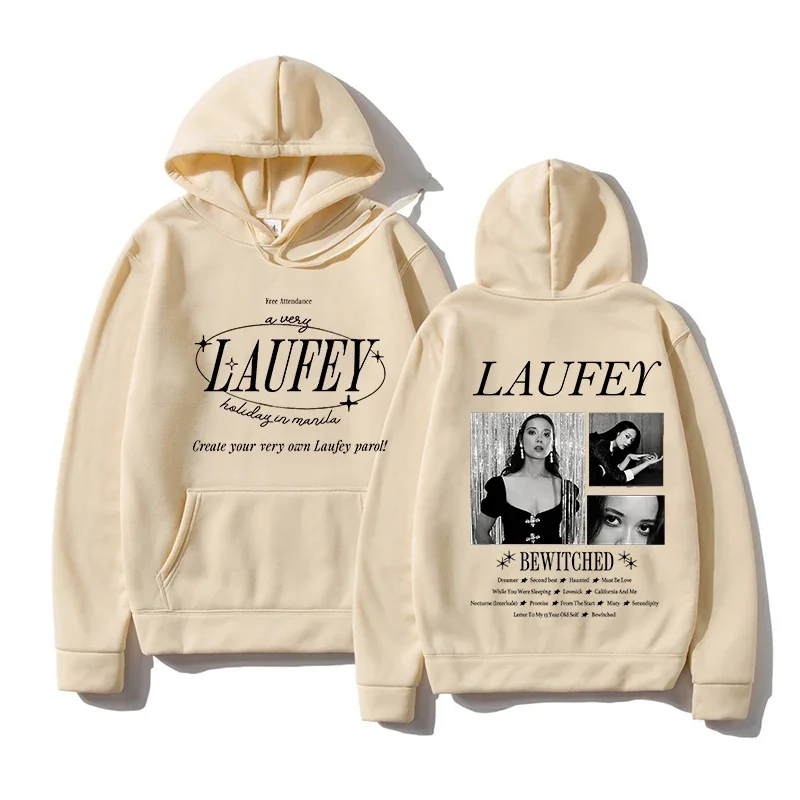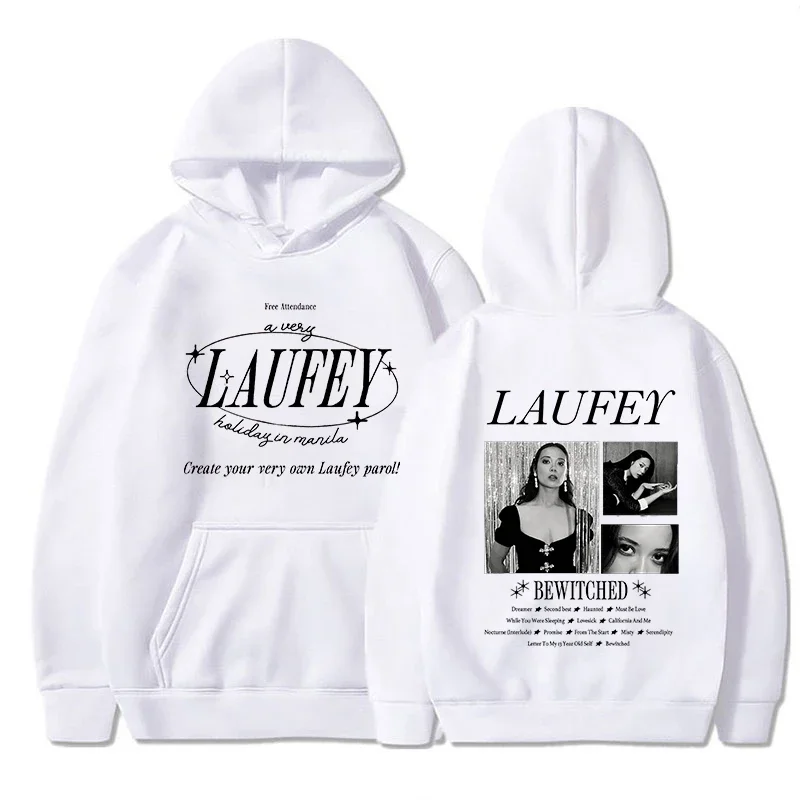 Get bewitched by this stunning Laufey hoodie that celebrates her iconic album artwork. The front features elegant gothic lettering with “Create your very own Laufey parody!” text, while the back showcases the atmospheric black and white album photography that defines the Bewitched era. This sleek black hoodie is the ultimate way to rep one of music’s most enchanting artists while keeping cozy and stylish.
