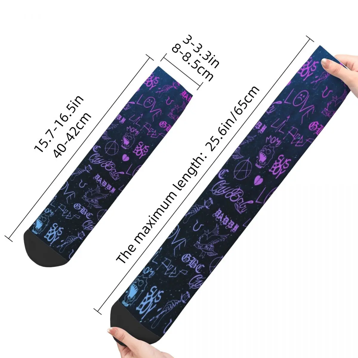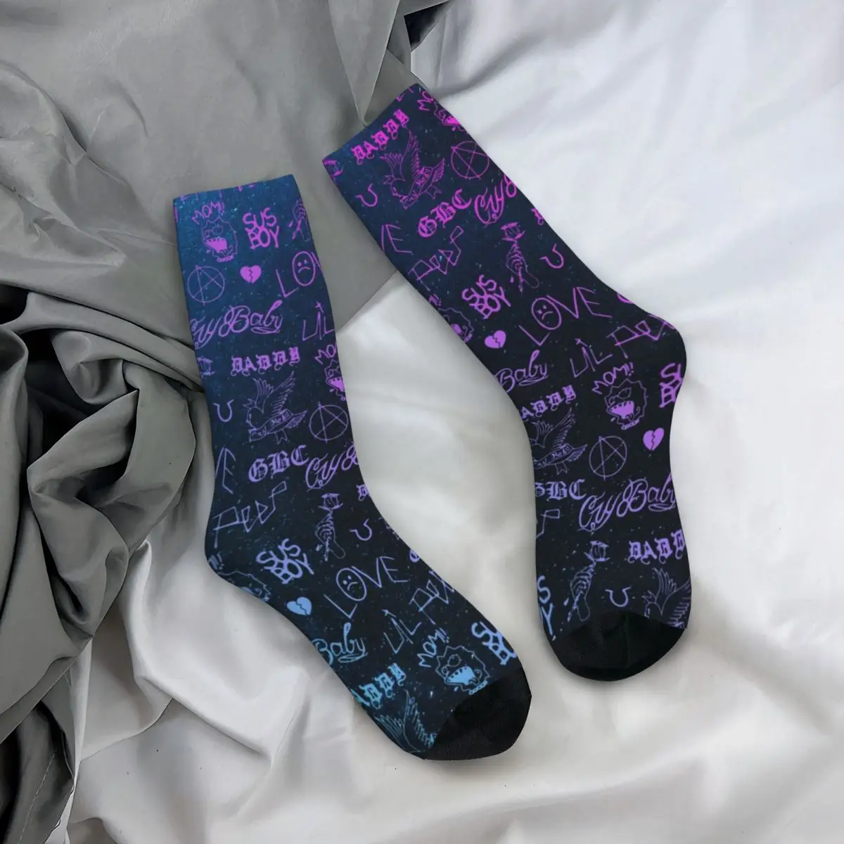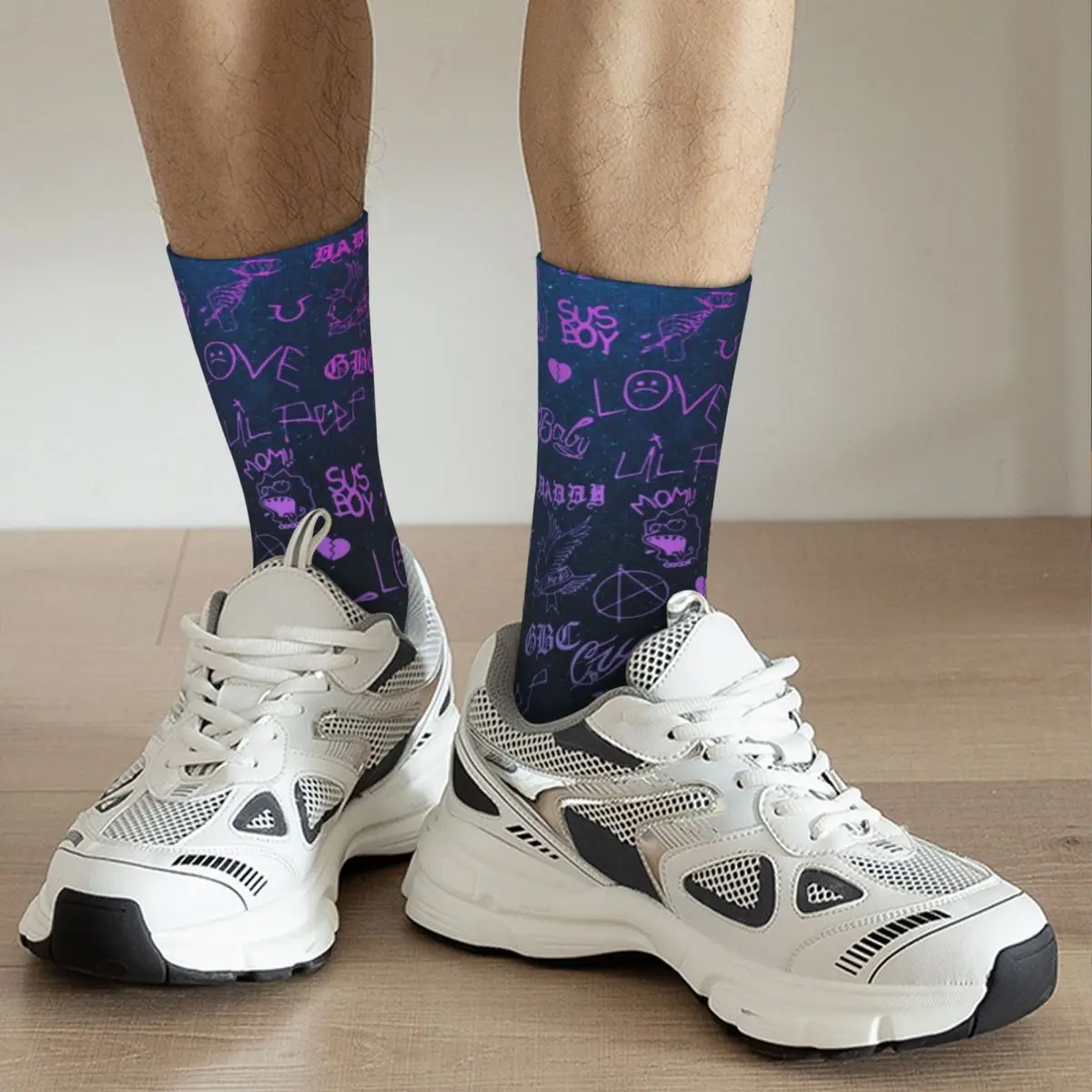 Rock these bold Lil Peep Sus Boys Graphic Print Socks and let your fandom show from the ground up! Featuring an all-over design of iconic goth-inspired graphics, winged motifs, and memorable text scattered across a dark navy base, these socks blend edgy aesthetics with comfortable style. The vibrant magenta and purple neon print really pops against the black heel and toe, making them a must-have for any Lil Peep fan who refuses to compromise on their look.