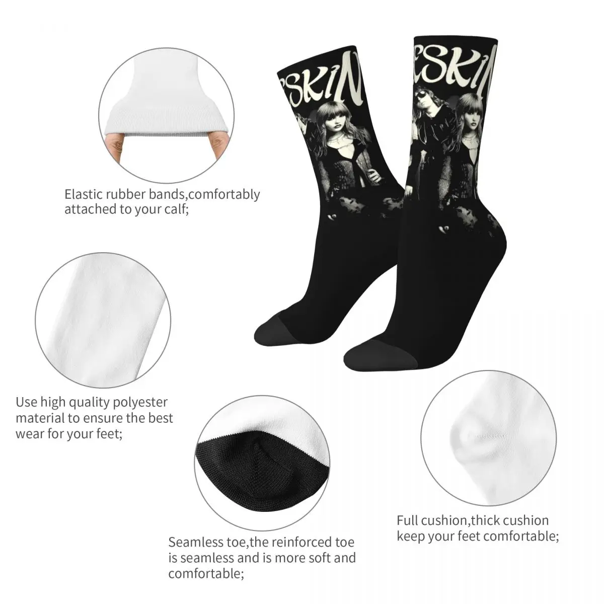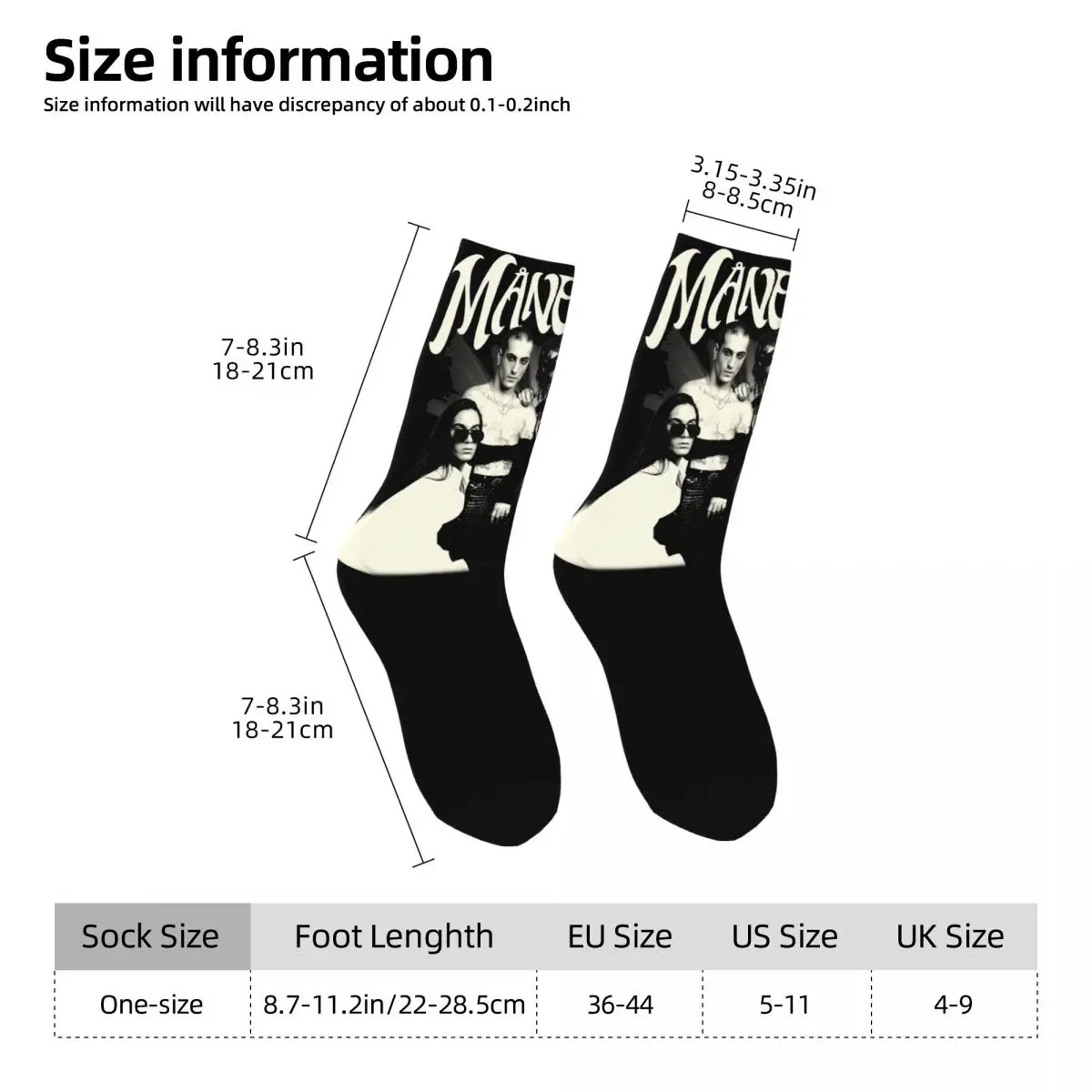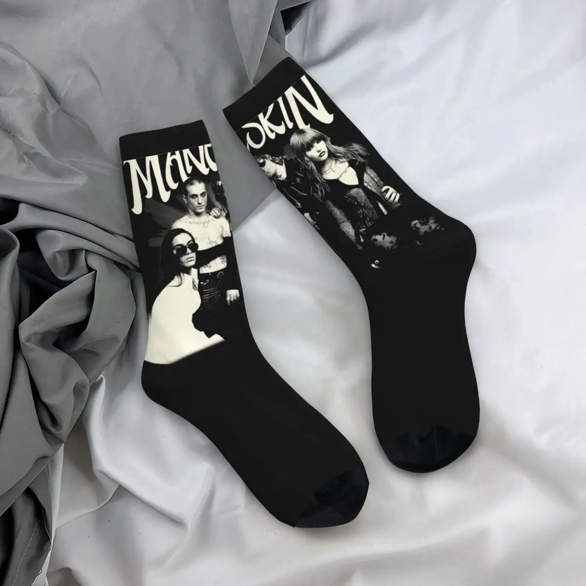 Rock your love for Maneskin with these stunning crew socks featuring the iconic Italian band in bold black and white imagery. The design showcases the band’s edgy aesthetic with striking portraits and the distinctive Maneskin logo across the cuff, perfect for any devoted fan. These are the ultimate way to wear your fandom on your feet and make a statement wherever you go.