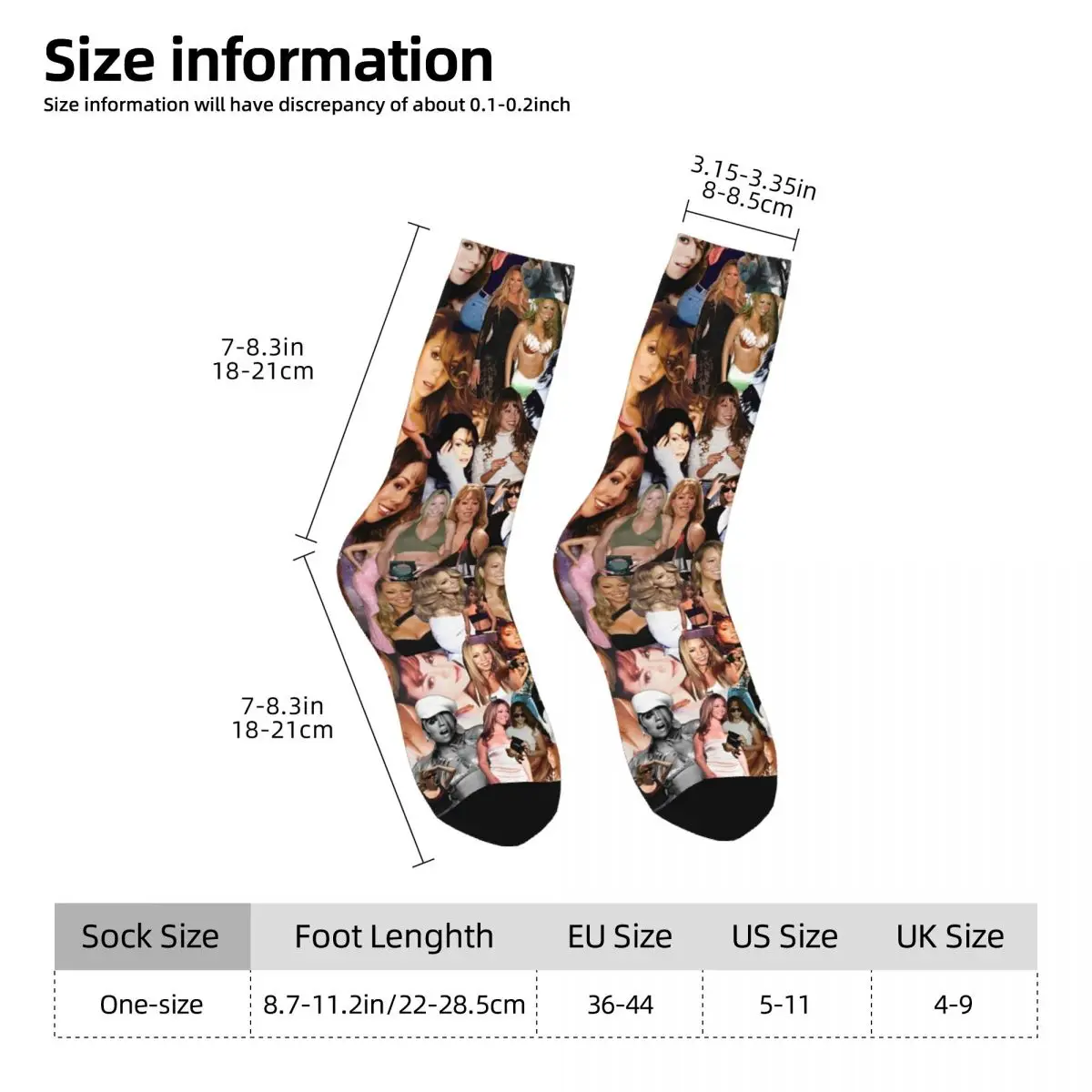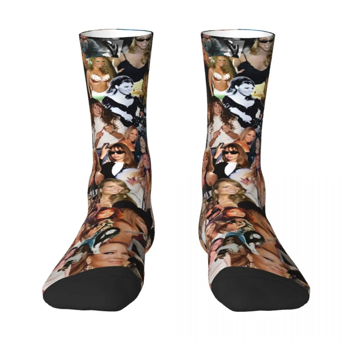 Celebrate the iconic pop legend with these amazing Mariah Carey Pop Queen Face Mash Socks! Featuring a vibrant collage of the Songbird Supreme’s most memorable looks and moments throughout her legendary career, these socks showcase Mimi in all her glory across the fabric. With a bold mix of colors and a black heel and toe for contrast, you’ll be walking on air while repping one of the greatest voices in music history. Perfect for any true Mariah fan who wants to keep their style fresh and their devotion visible!