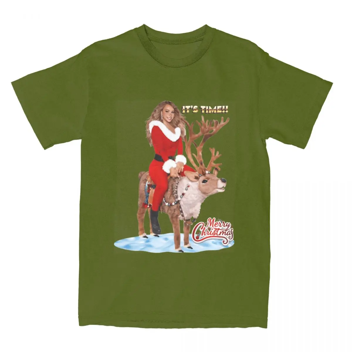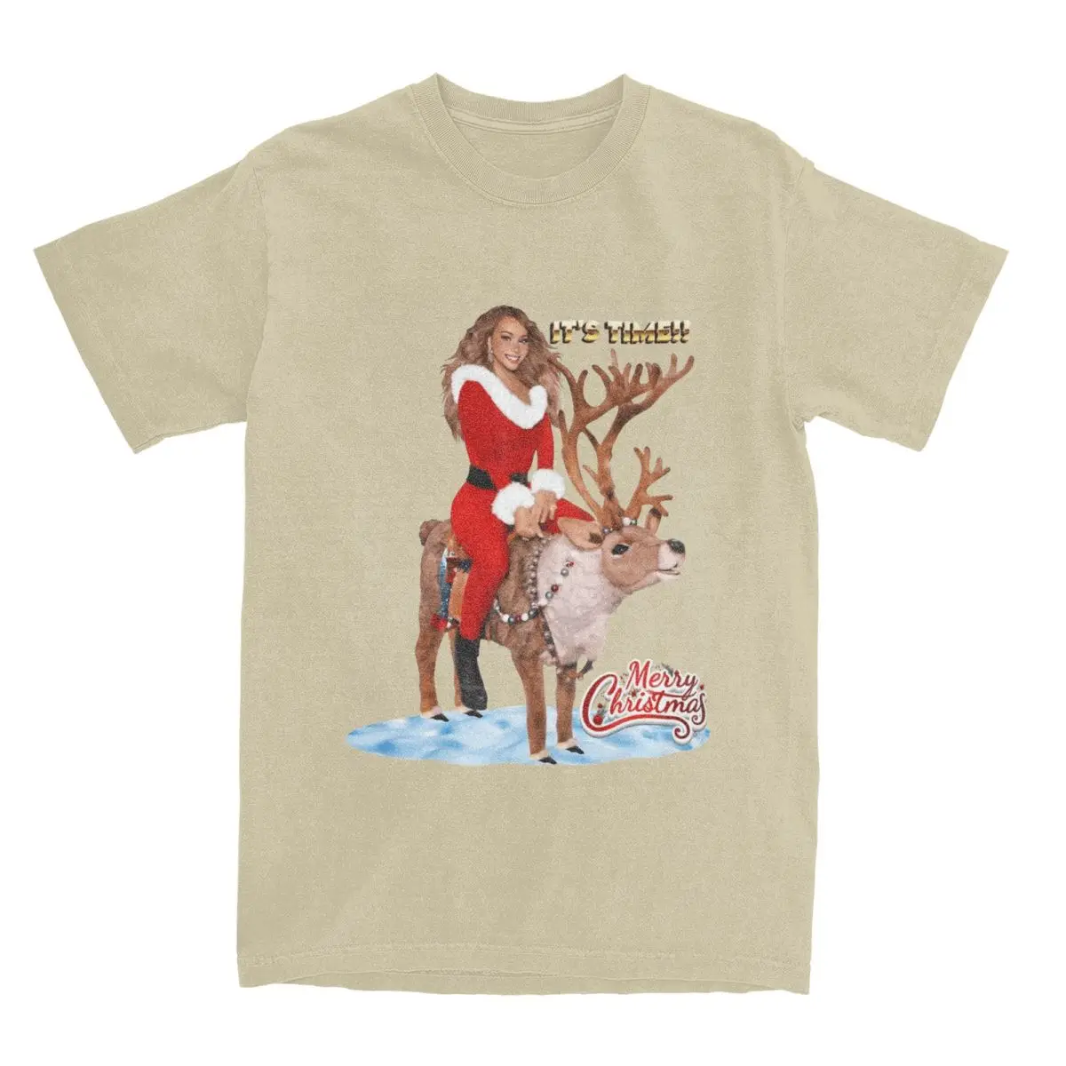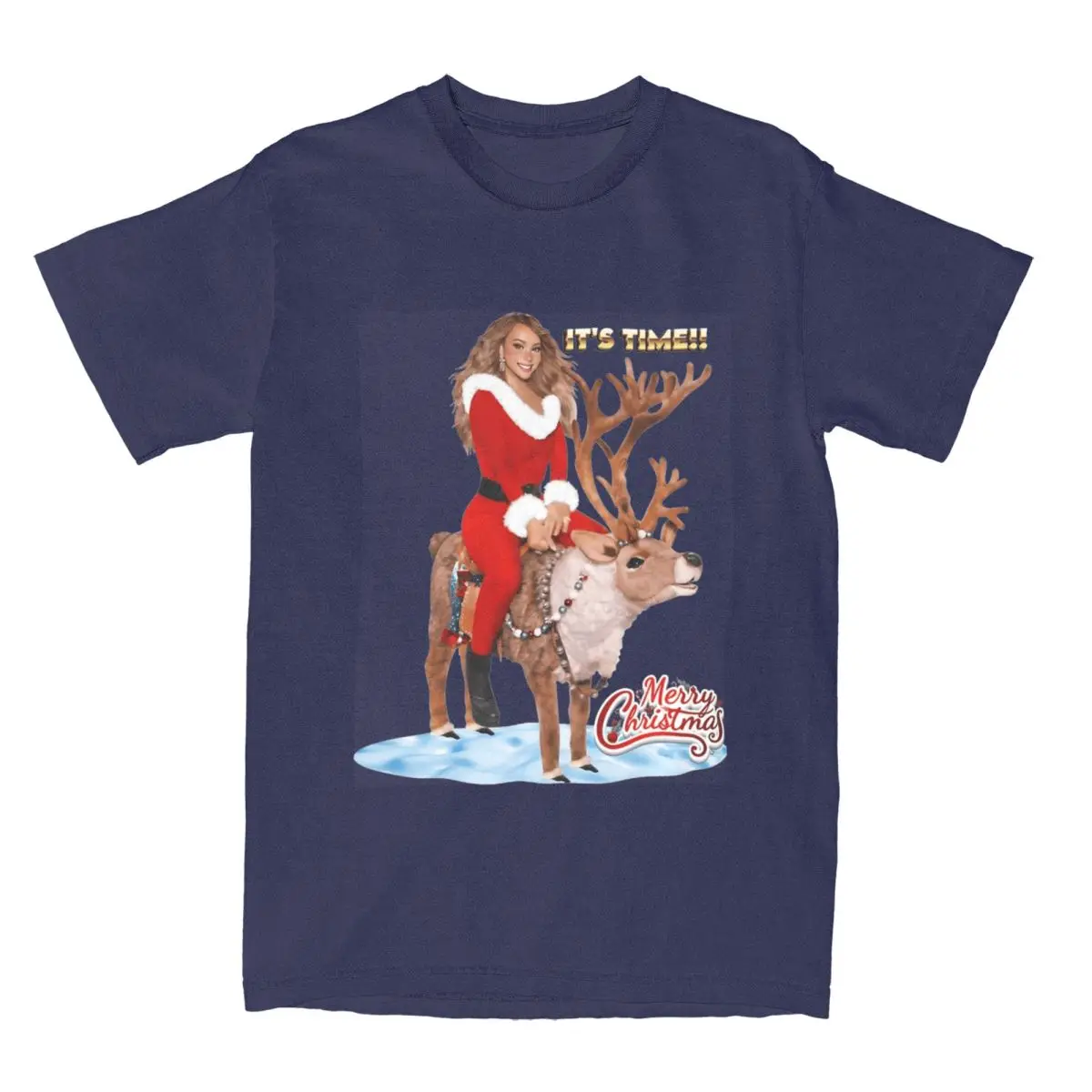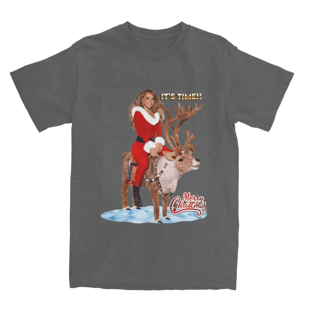 Get ready to sleigh this holiday season with this iconic Mariah Carey Santa tee! Featuring the Queen of Christmas herself in a show-stopping red Santa outfit, riding a majestic reindeer with “IT’S TIME!!” emblazoned across the top. The festive design captures that pure holiday magic with snowy details and the classic “Merry Christmas” script, making it the ultimate must-have for any Mariah fan who lives for the most wonderful time of the year.