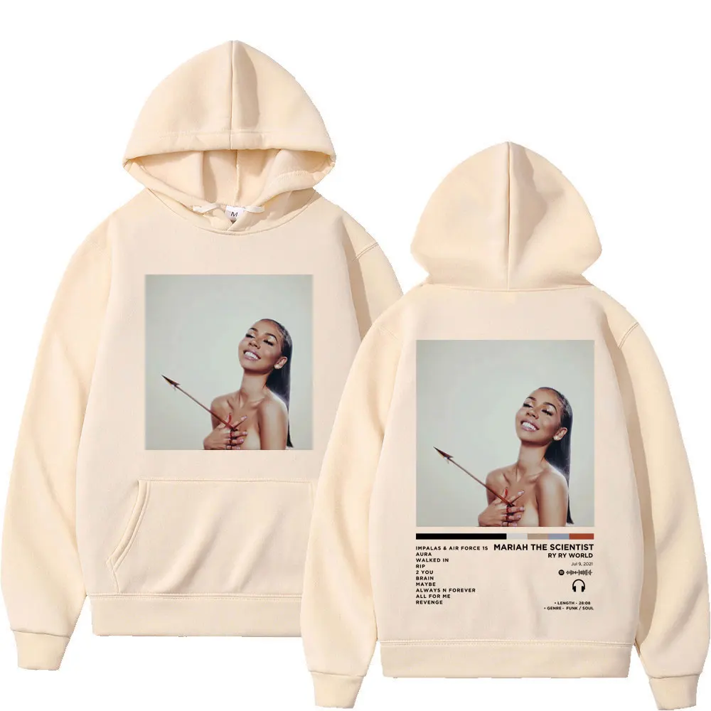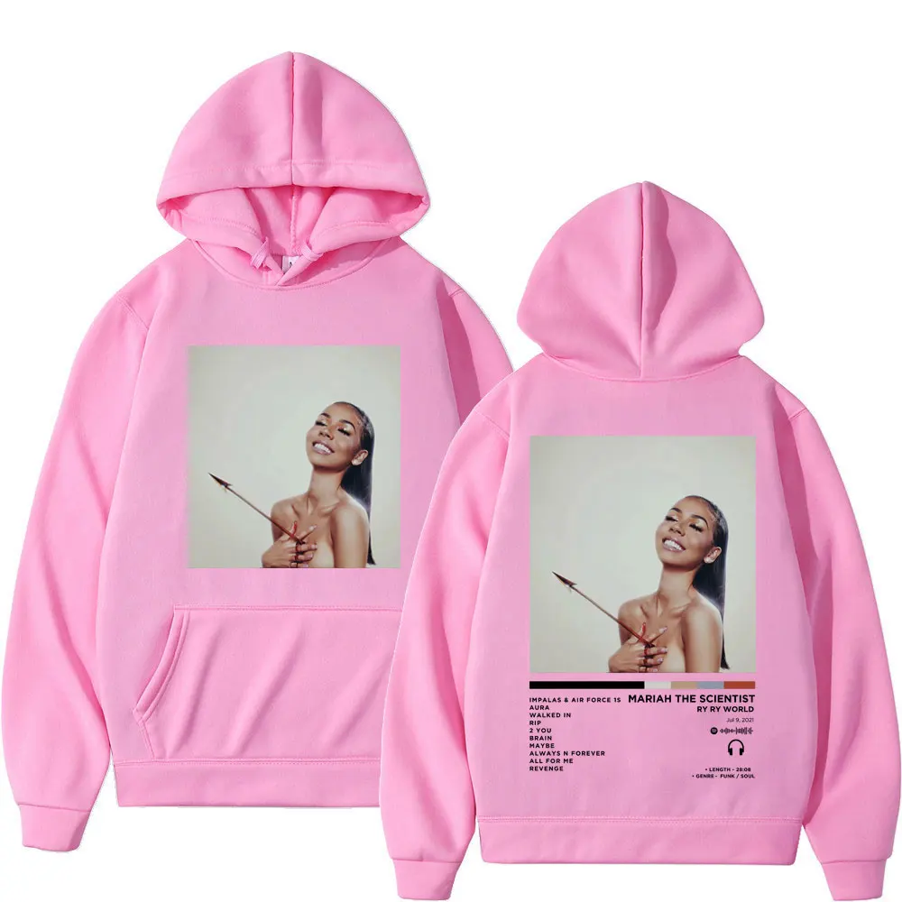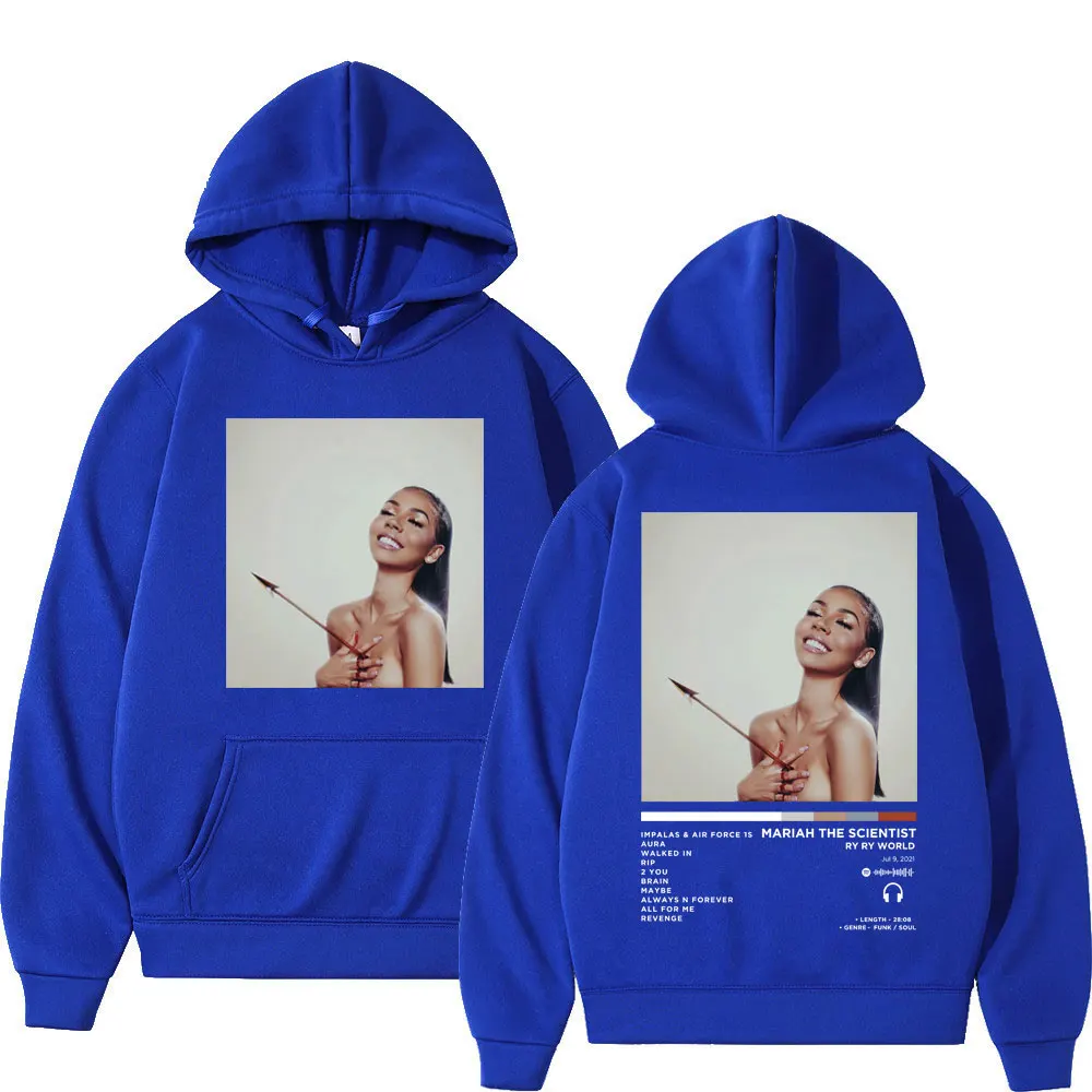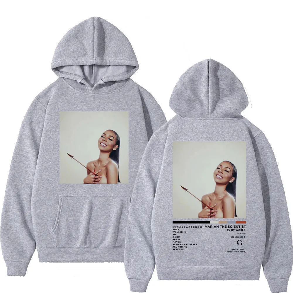 Rock the Mariah The Scientist ‘Ry Ry World’ hoodie and show your love for the rising hip-hop star. This sleek black pullover features her iconic portrait on the front, with the album tracklist and release details printed on the back. The minimalist design captures her artistic vision perfectly, making it an essential piece for any dedicated fan.