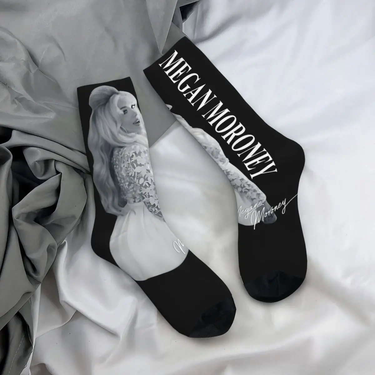 Rock your love for Megan Moroney with these stunning Aesthetic Fan Essential Socks! Featuring a sleek black and white design, these crew socks showcase bold “WE GAIN MORONEY” text running down the sides paired with gorgeous marble-textured panels in soft grays and whites. The elegant script signature design at the heel completes the sophisticated look, making these the perfect addition to any true fan’s collection.