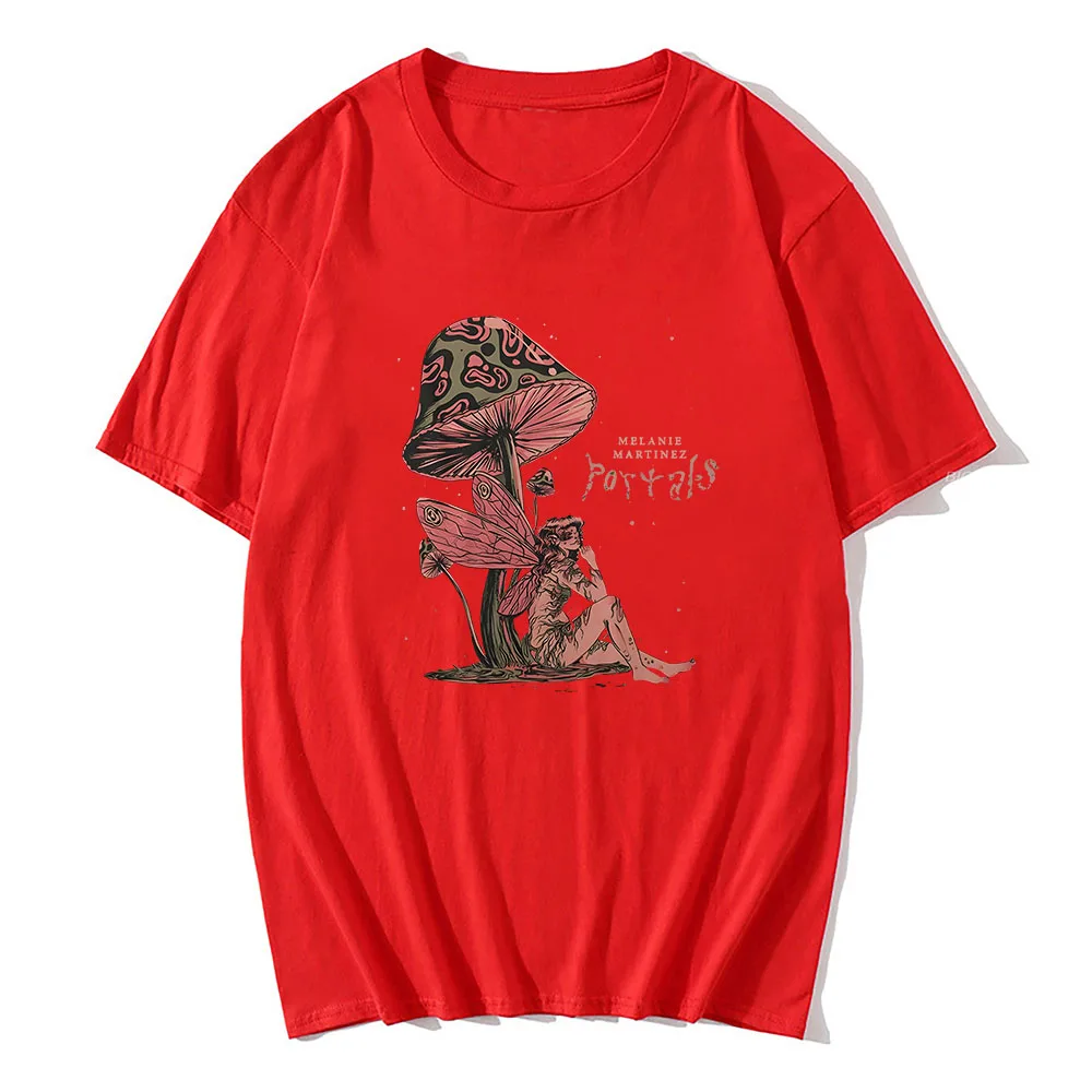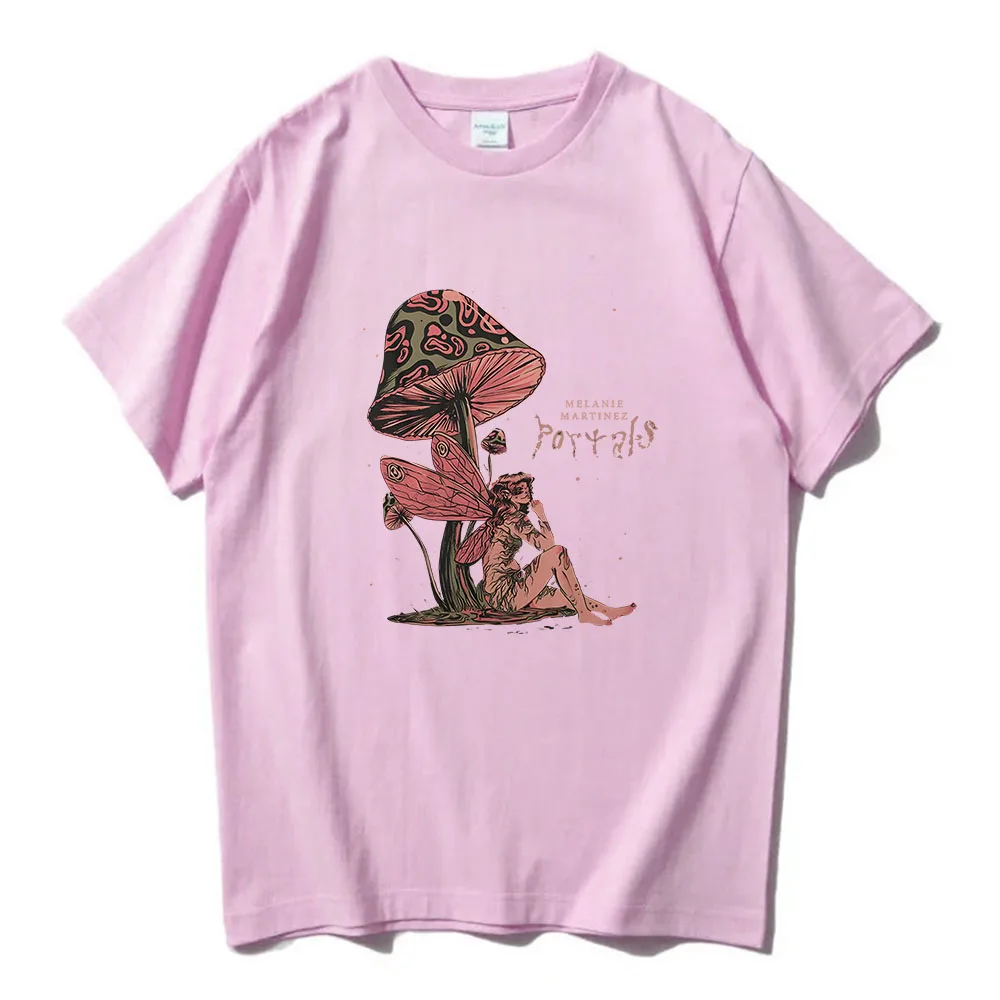 This dreamy cream tee brings Melanie Martinez’s whimsical aesthetic to life with a hauntingly beautiful illustration of a figure sheltering beneath intricately patterned mushrooms. The delicate linework and soft pink and dark green color palette perfectly capture that signature otherworldly vibe from her Portals era. It’s the perfect piece for fans who love artistic, alternative fashion that doubles as wearable art.