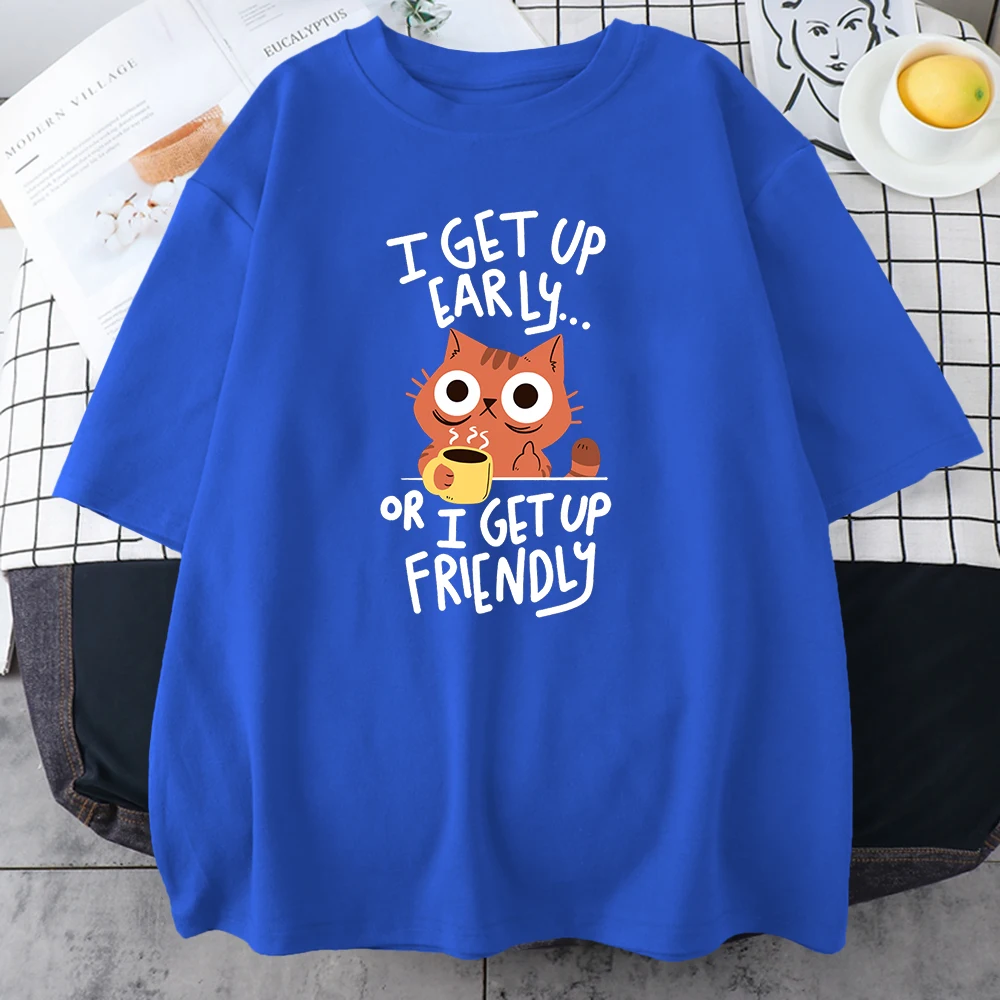This adorable Morning Cat Coffee t-shirt captures the relatable struggle of early mornings with humor and charm! Featuring a cute orange cat clutching a steaming mug with the hilarious text “I GET UP EARLY… OR I GET UP FRIENDLY,” this design perfectly speaks to coffee lovers everywhere. The charming illustration paired with the witty message makes it an instant favorite for anyone who needs caffeine to find their personality in the morning.