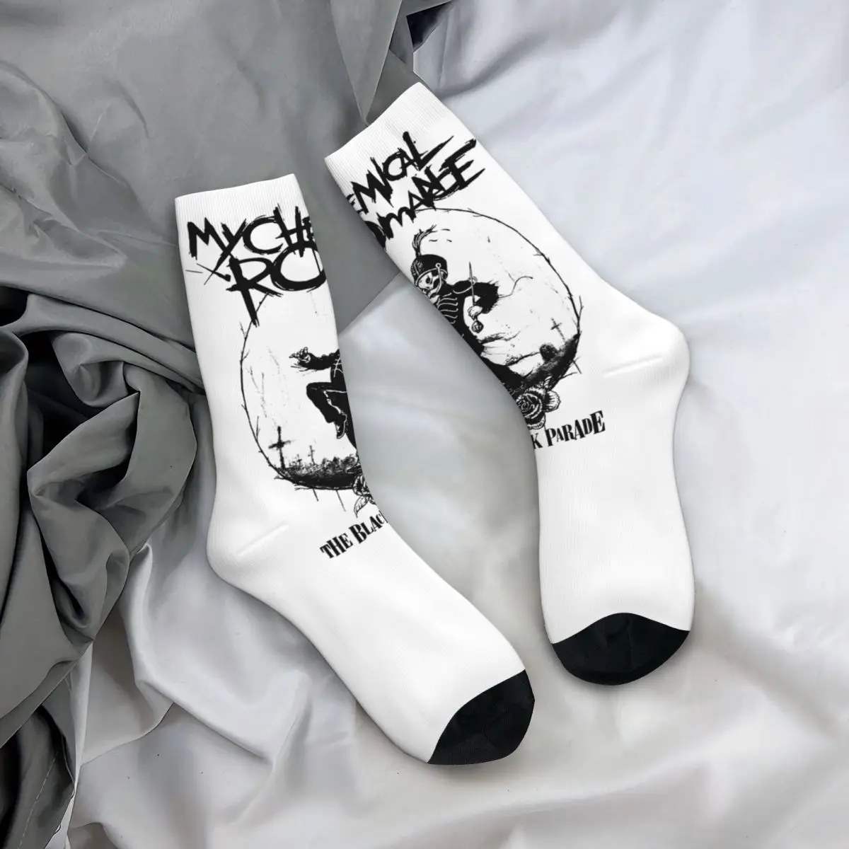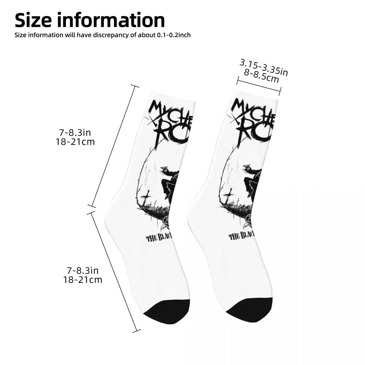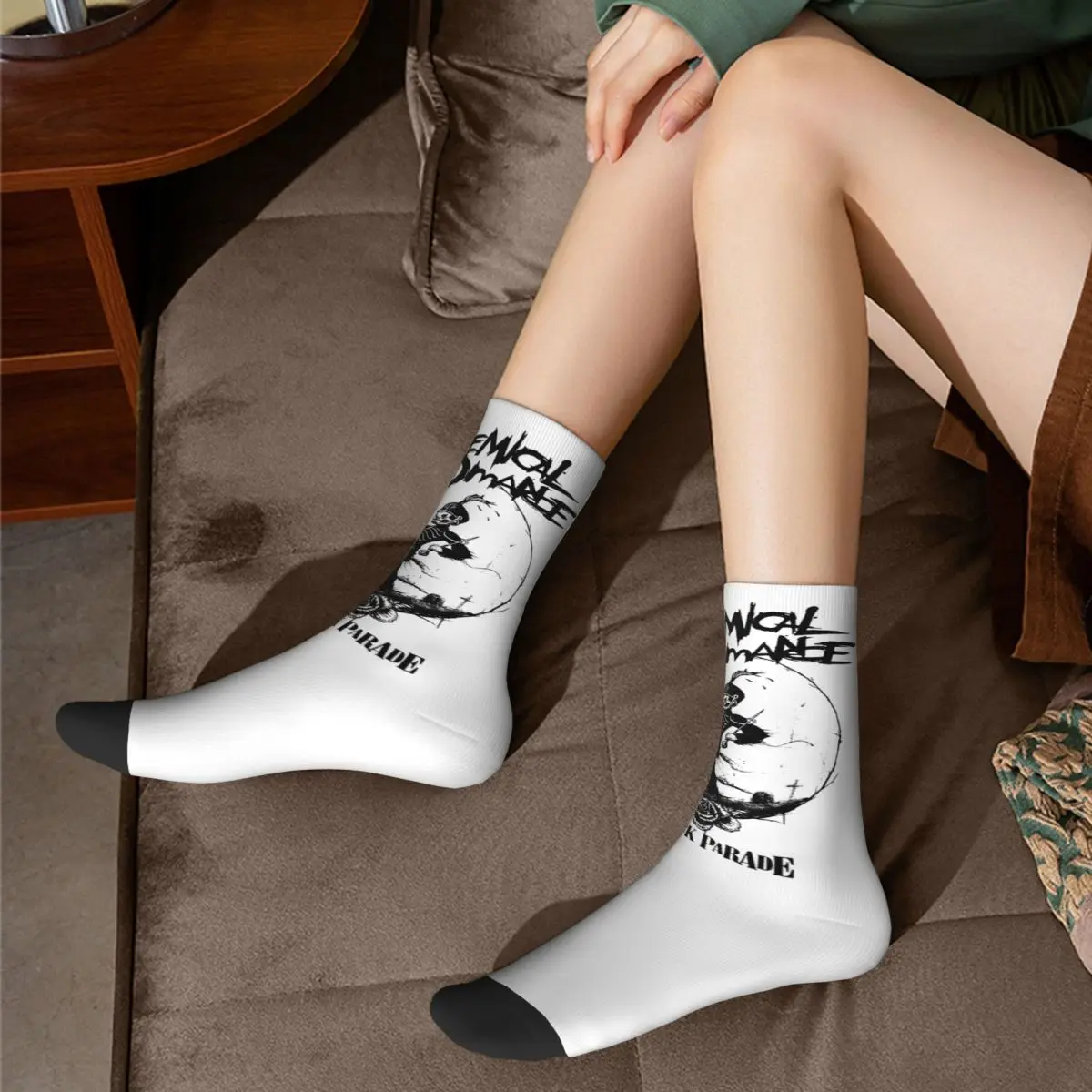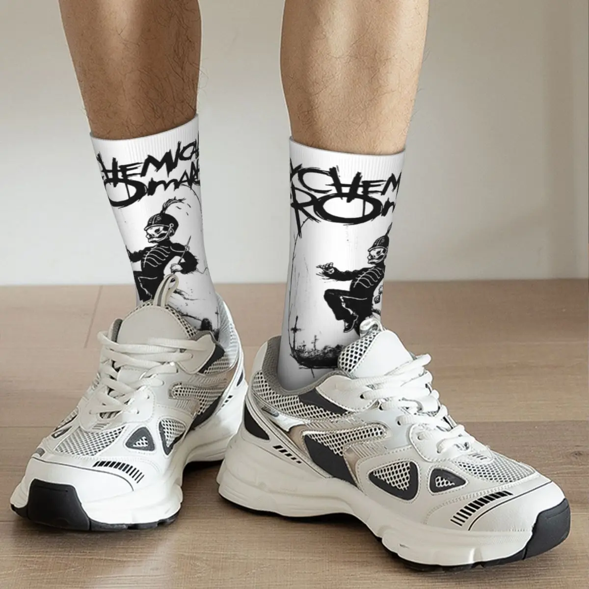 Rock your MCR pride with these striking My Chemical Romance socks featuring the iconic Black Parade artwork. The white crew socks showcase bold black graphics of the band’s legendary masked figure and dramatic imagery, complete with the band’s text and rose motif that perfectly captures the gothic aesthetic of their classic album. With contrasting black heel and toe, these socks are a must-have for any devoted fan ready to parade their passion.