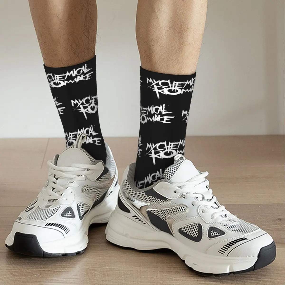 Rock your MCR fandom with these iconic My Chemical Romance socks! Featuring the band’s signature logo scattered across a bold black background with crisp white lettering, these socks are a must-have for any true fan. The all-over repeat pattern showcases that classic emo aesthetic that defined a generation of music lovers. Perfect for showing your love for the legendary rock band in the most comfortable way possible.