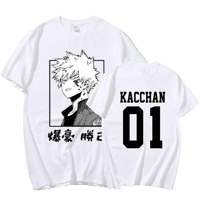 Embrace your love for My Hero Academia’s most explosive character with this striking double-sided tee! The front features Bakugo’s iconic spiky blonde hair and intense expression in bold black and white illustration, complete with Japanese characters that capture his fierce personality. Flip it around to reveal the back with “KACHAN 01” in sports-style lettering—a perfect nod to fans who know the character’s true name. This bold, oversized fit is pure anime streetwear energy.