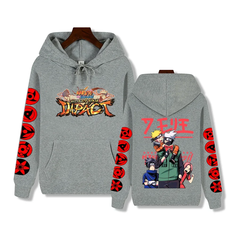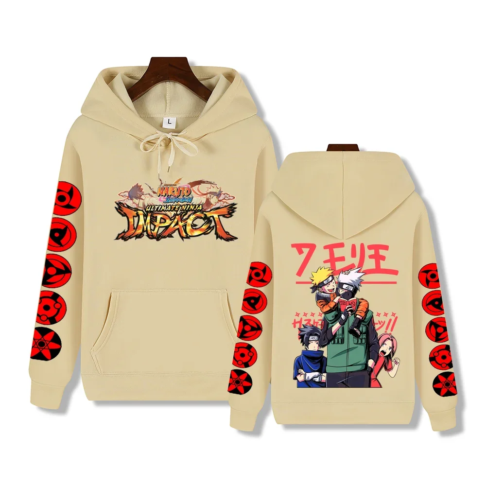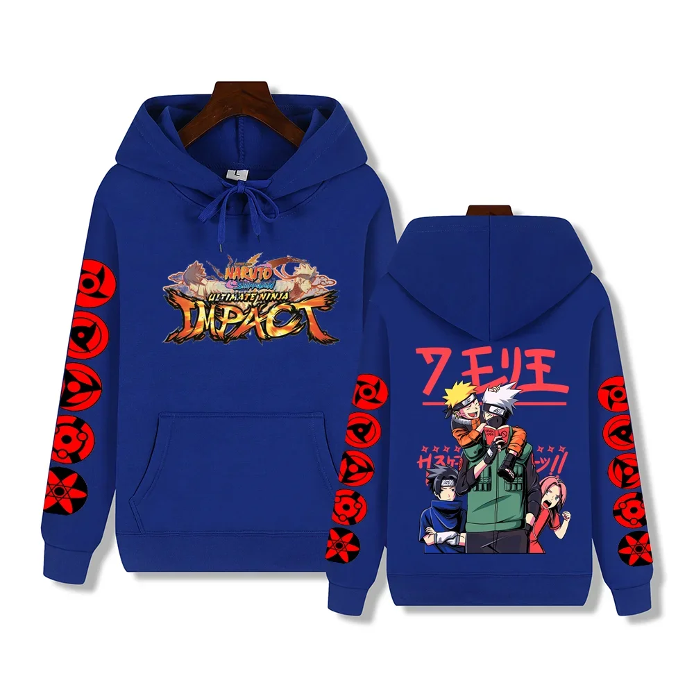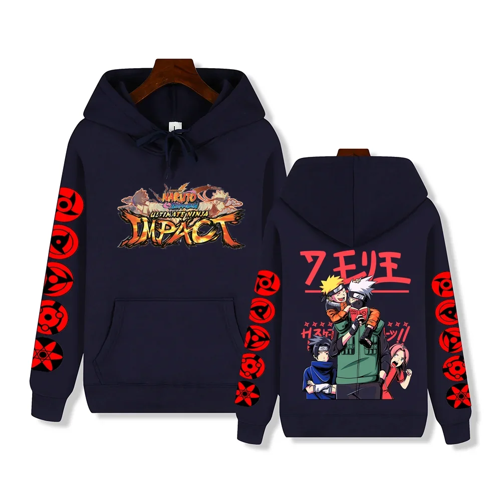 This Naruto Ultimate Ninja Impact hoodie is an absolute must-have for fans of the legendary series. The front features the iconic game logo in fiery gold and orange, while the back showcases Naruto, Sasuke, and Kakashi in stunning detail with bold red kanji characters. The sleeves are lined with the Uchiha clan symbol in vibrant red, making this a true collector’s piece that celebrates both the anime and the gaming universe.