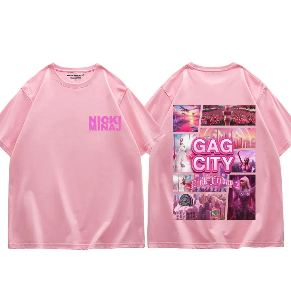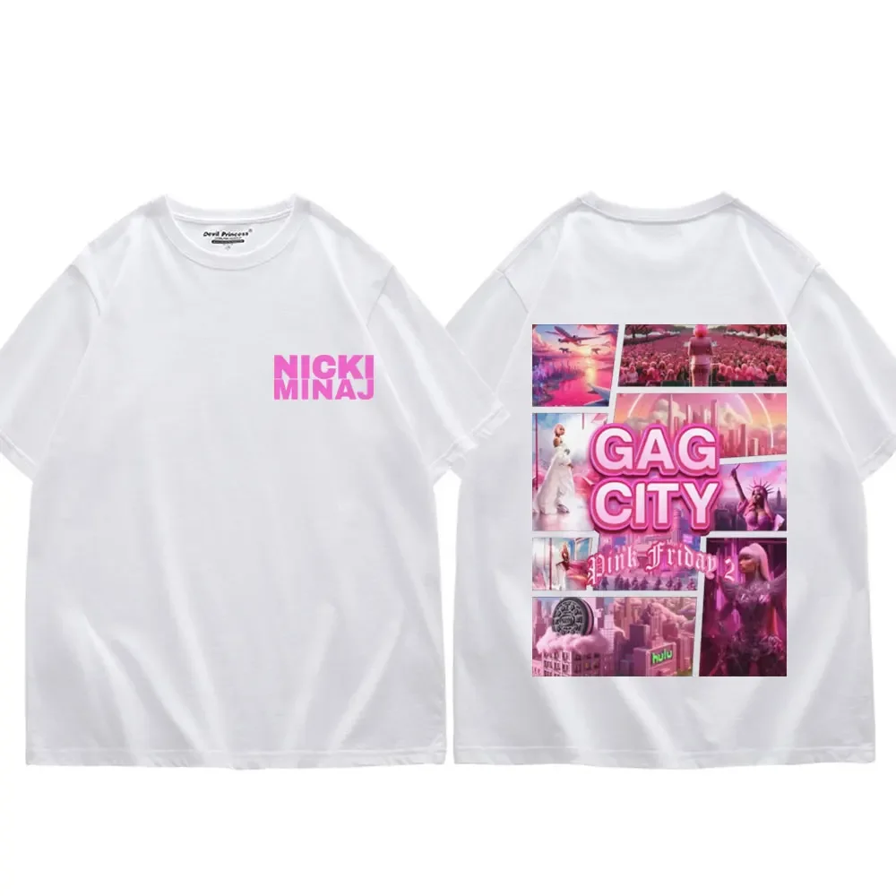 Rep the Queen of Rap with this iconic Nicki Minaj Gag City Pink Friday t-shirt! The front features her name in bold hot pink lettering against classic black, while the back showcases a vibrant collage of scenes from her legendary Pink Friday 2 era in stunning pink and purple hues. This oversized tee captures the essence of one of hip-hop’s most influential artists with exclusive concert and promotional imagery that’ll have all the Barbz recognizing your dedication instantly.