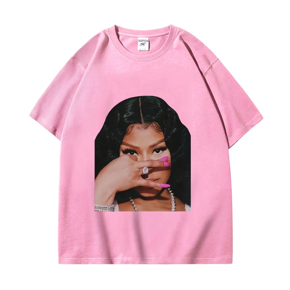 Rock this bold Nicki Minaj graphic tee featuring the rap icon herself in an iconic pose with her signature style. The striking design captures her fierce attitude with vibrant pink nails and glamorous jewelry against a crisp white backdrop. Perfect for showing your love for one of hip-hop’s biggest stars, this tee lets you wear your fandom loud and proud.