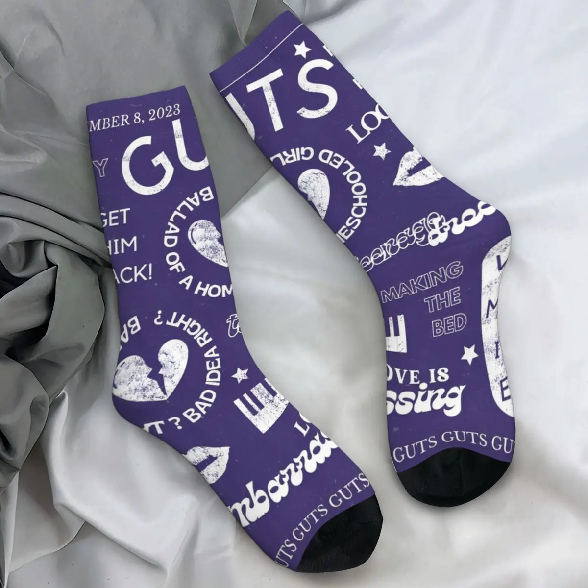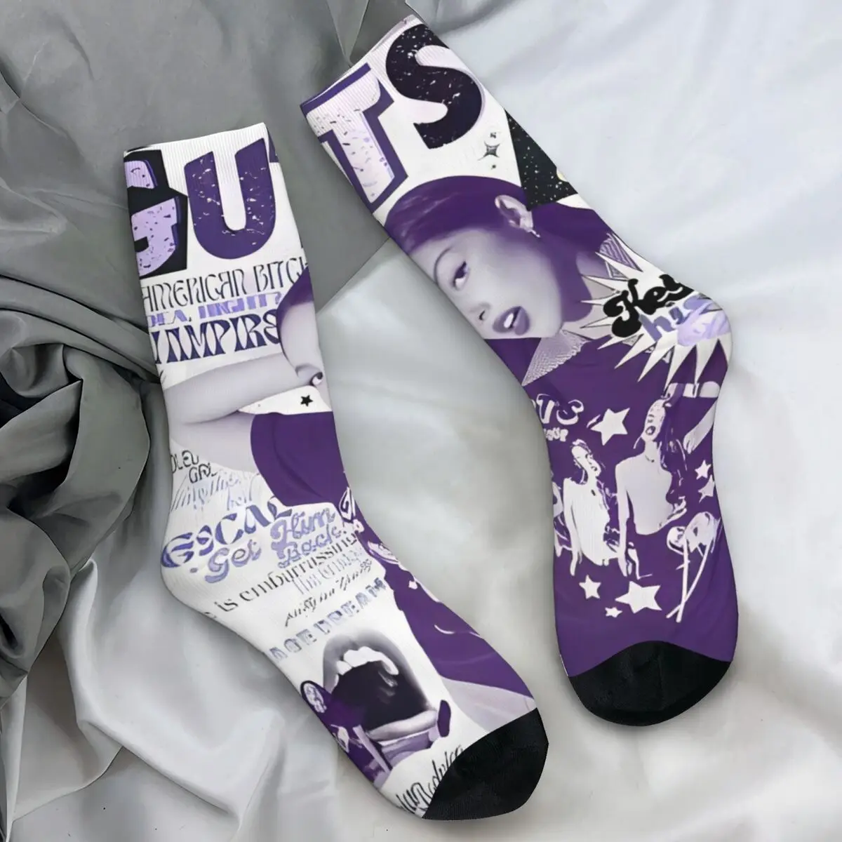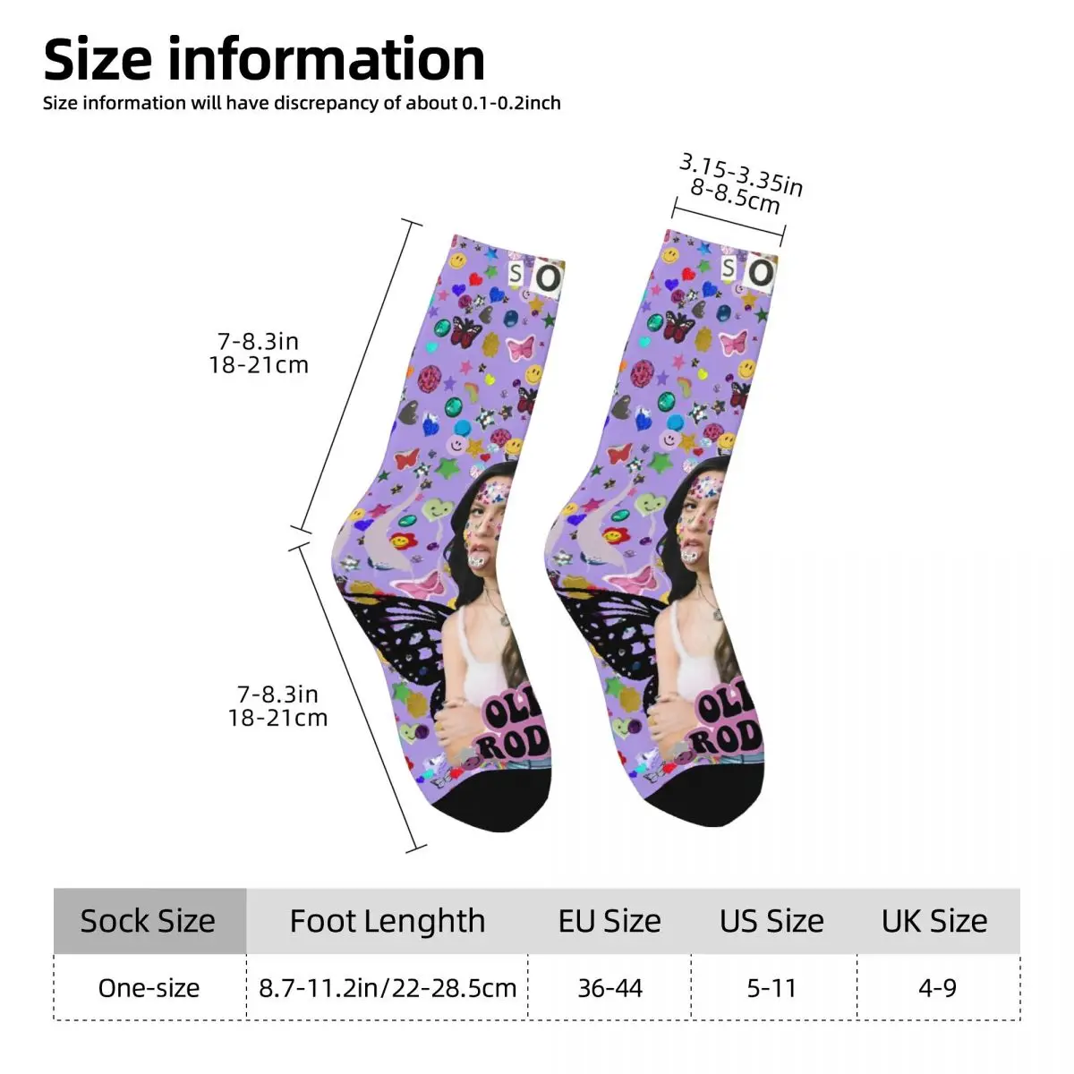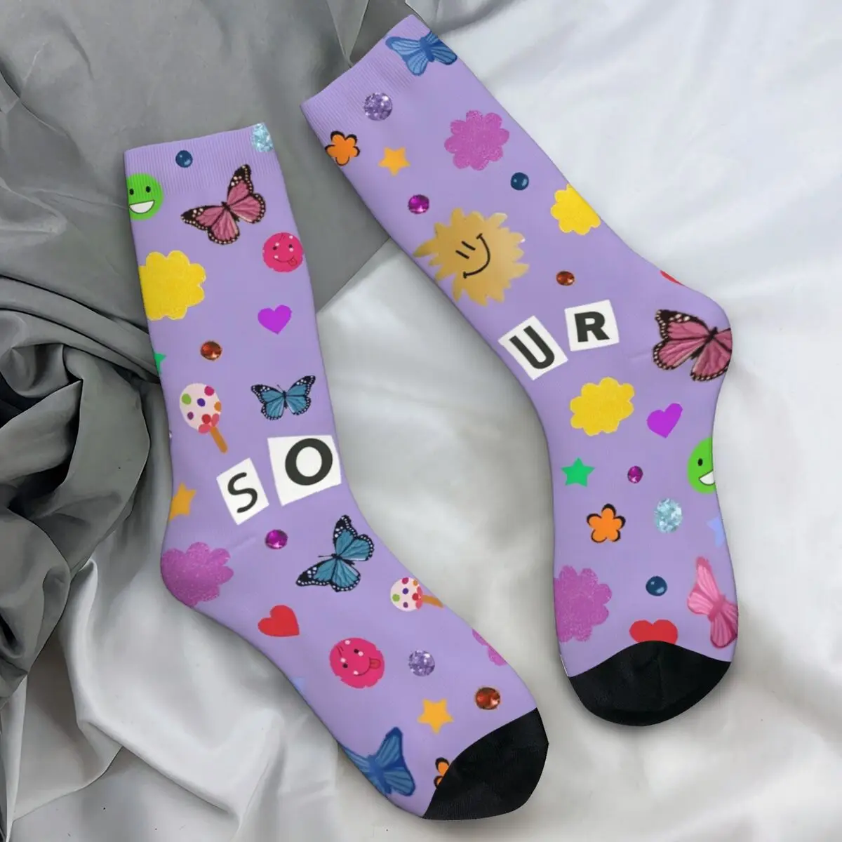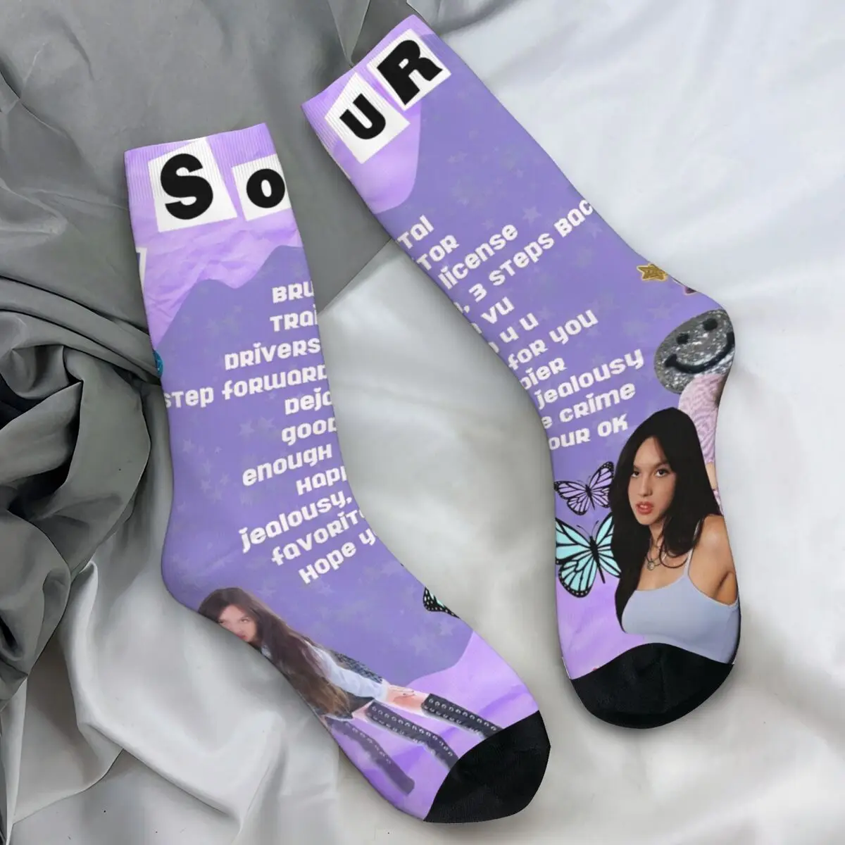 Step into Olivia Rodrigo’s colorful world with these stunning Sour Tour socks! The vibrant purple design bursts with playful Y2K-inspired elements—hearts, stars, rainbows, smiley faces, and butterflies—creating a nostalgic aesthetic that perfectly captures the pop superstar’s vibe. Featuring Olivia’s iconic imagery and bold ‘SOUR’ text, these crew socks blend artistic expression with comfort, making them the ultimate addition for any dedicated fan’s collection.