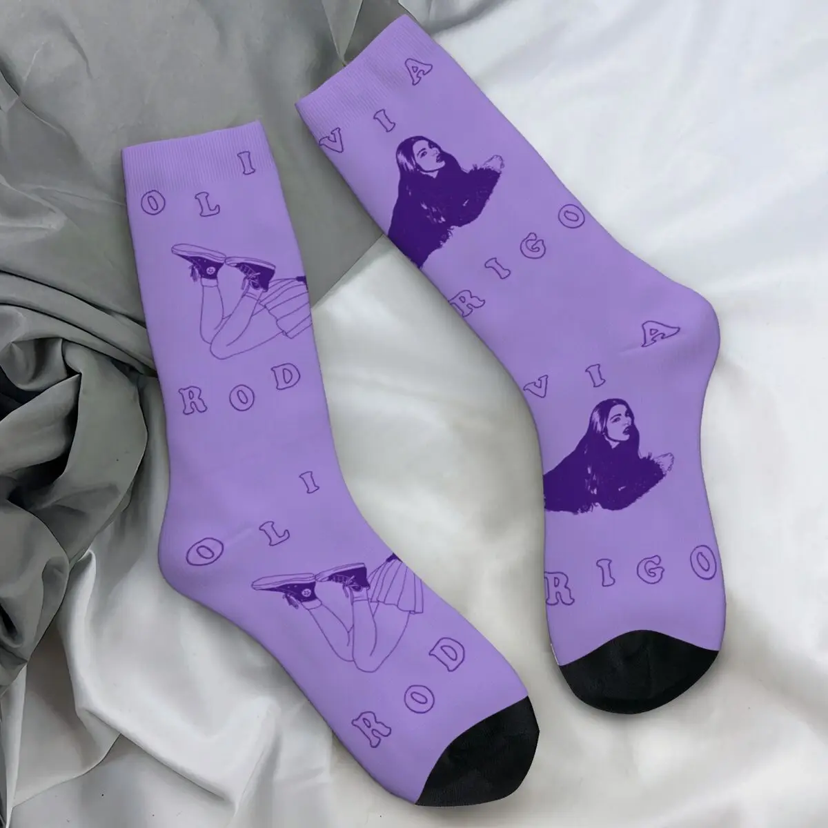These Olivia Rodrigo Sour socks are an absolute must-have for any devoted fan of the pop sensation! Featuring iconic imagery from her debut album, the socks showcase her silhouette in striking purple tones alongside heart-shaped candy motifs, purple roses, and playful lip designs scattered across a crisp white background. The bold, moody aesthetic perfectly captures the essence of Sour, making these socks the perfect way to wear your fandom on your feet.