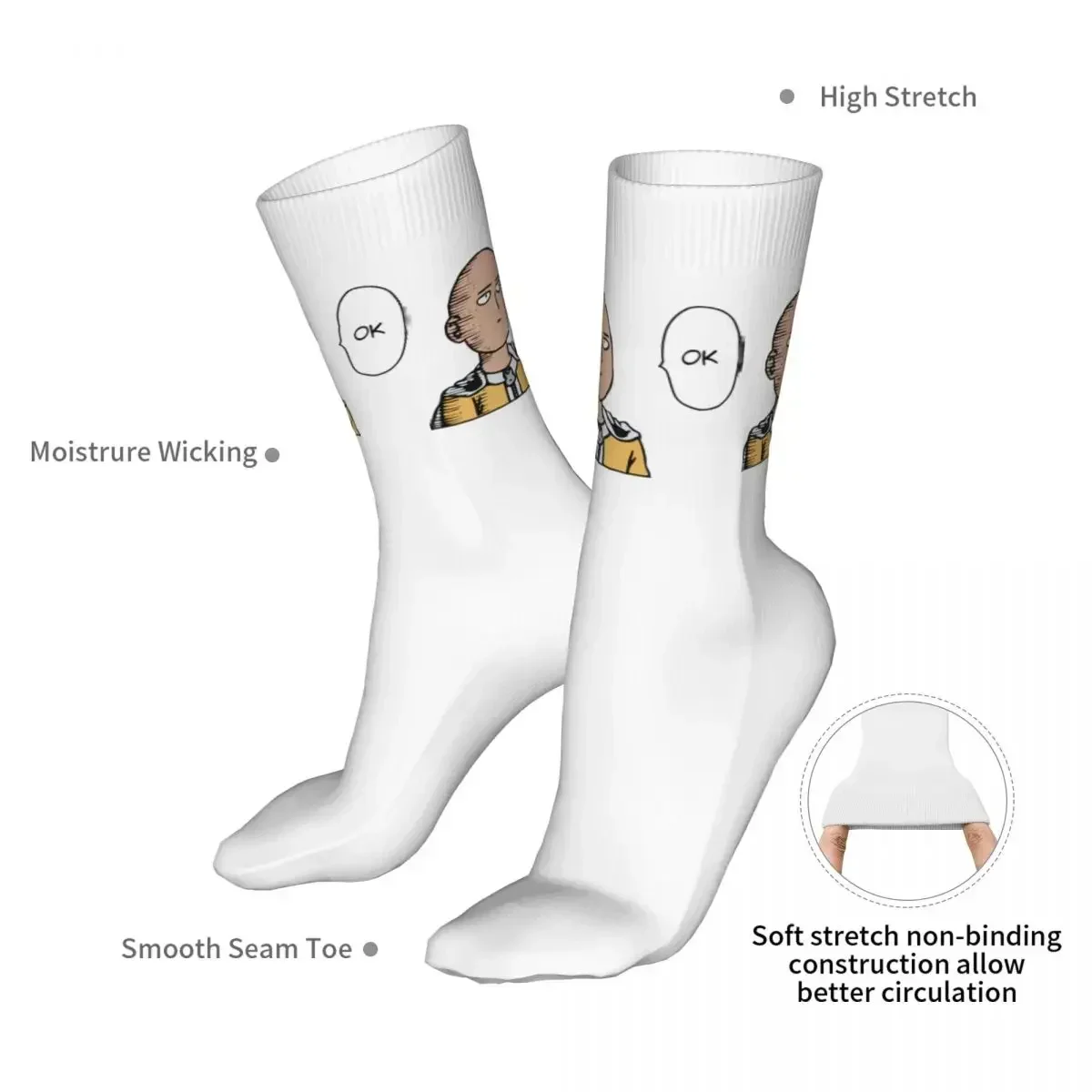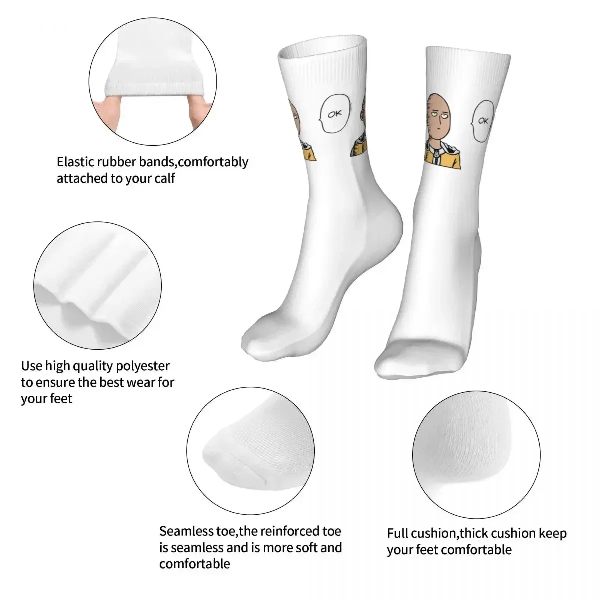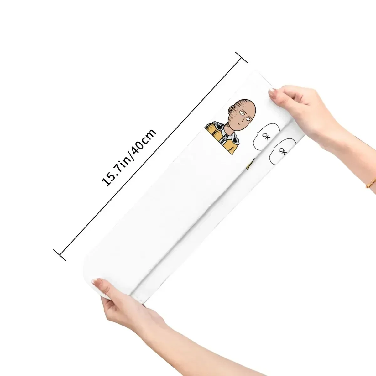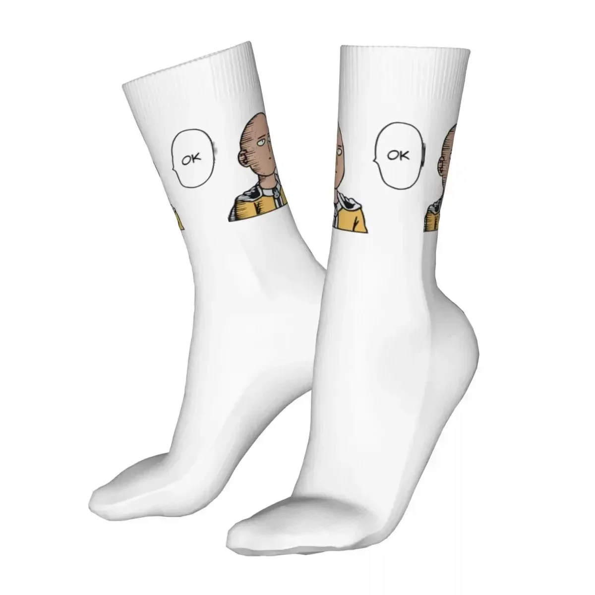 Show your love for One Punch Man with these hilarious OK Knitted Socks featuring the iconic expressionless face of Saitama himself! The clean white base is perfectly complemented by the tan-colored character design and cheerful yellow accents that really pop. Whether you’re a casual fan or a die-hard devotee, these socks bring that signature deadpan humor straight to your feet with every step.