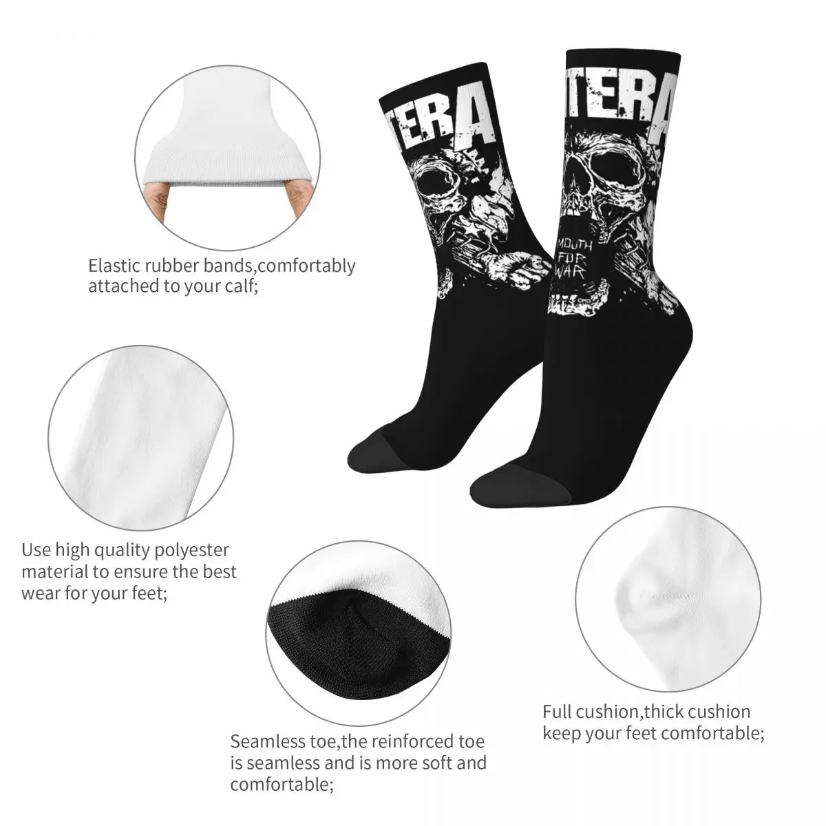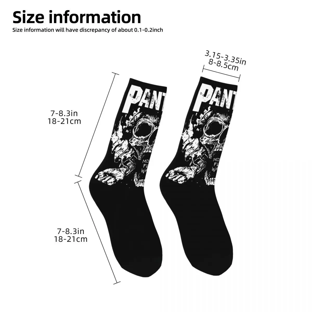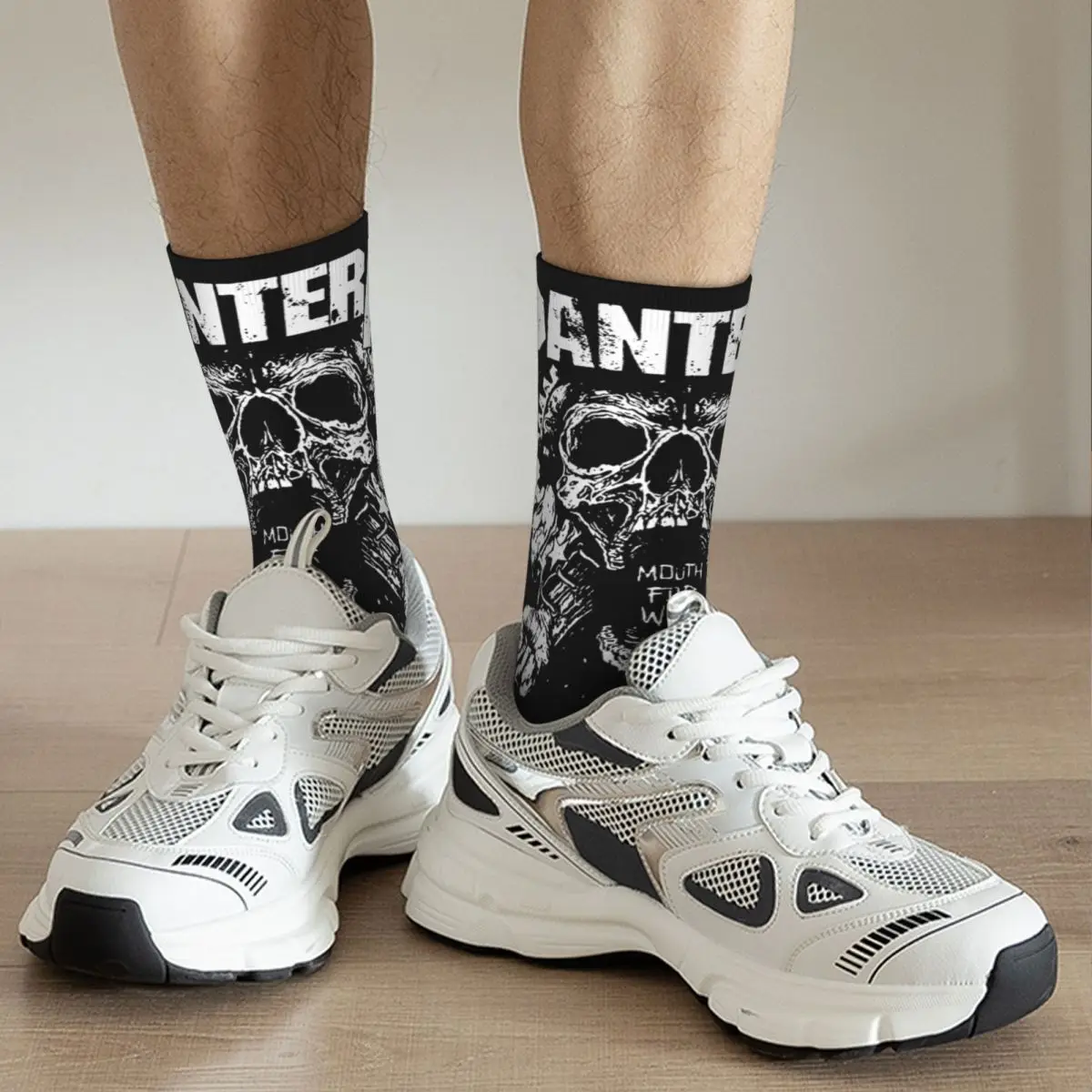 These Pantera socks are an absolute must-have for metalheads who live and breathe the legendary Texas groove metal band. Featuring striking black and white artwork with menacing skull imagery and the iconic PANTERA lettering across the cuff, these socks showcase the raw, aggressive aesthetic that defines the band’s legendary legacy. The bold graphic design captures that classic heavy metal attitude perfectly, making them the ultimate addition to any die-hard fan’s collection.