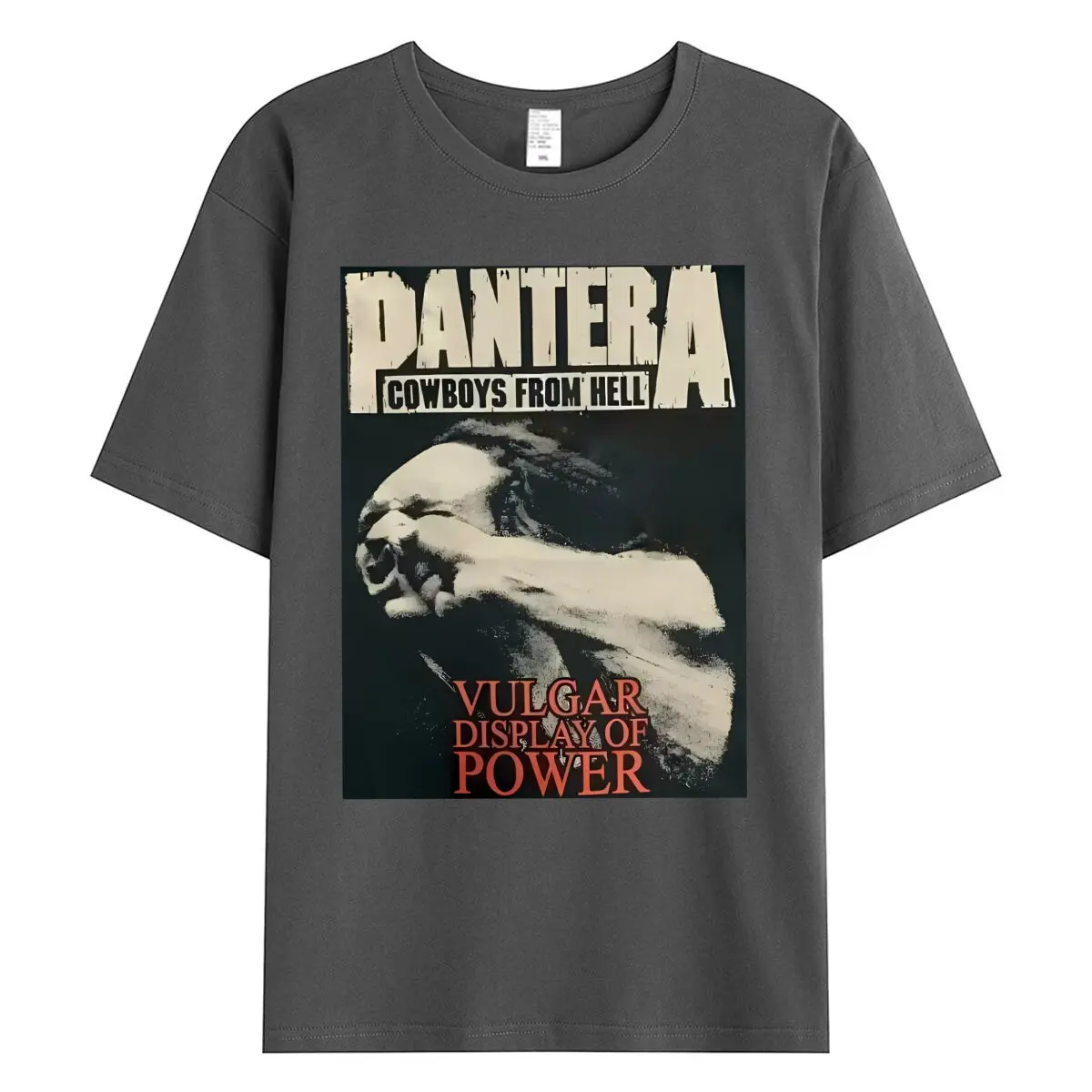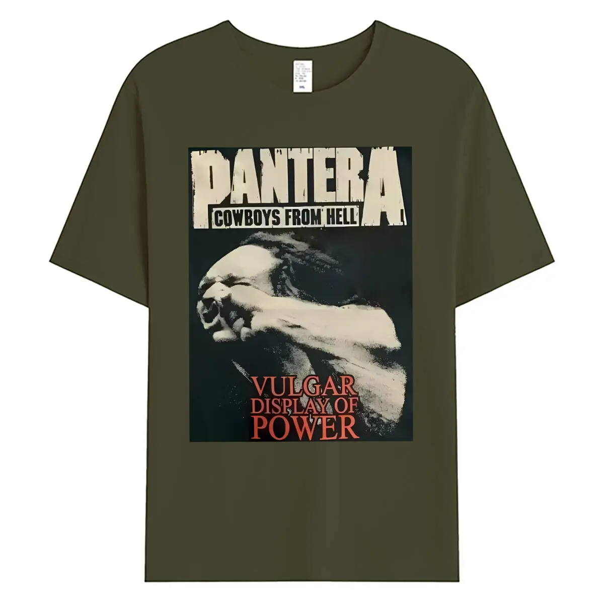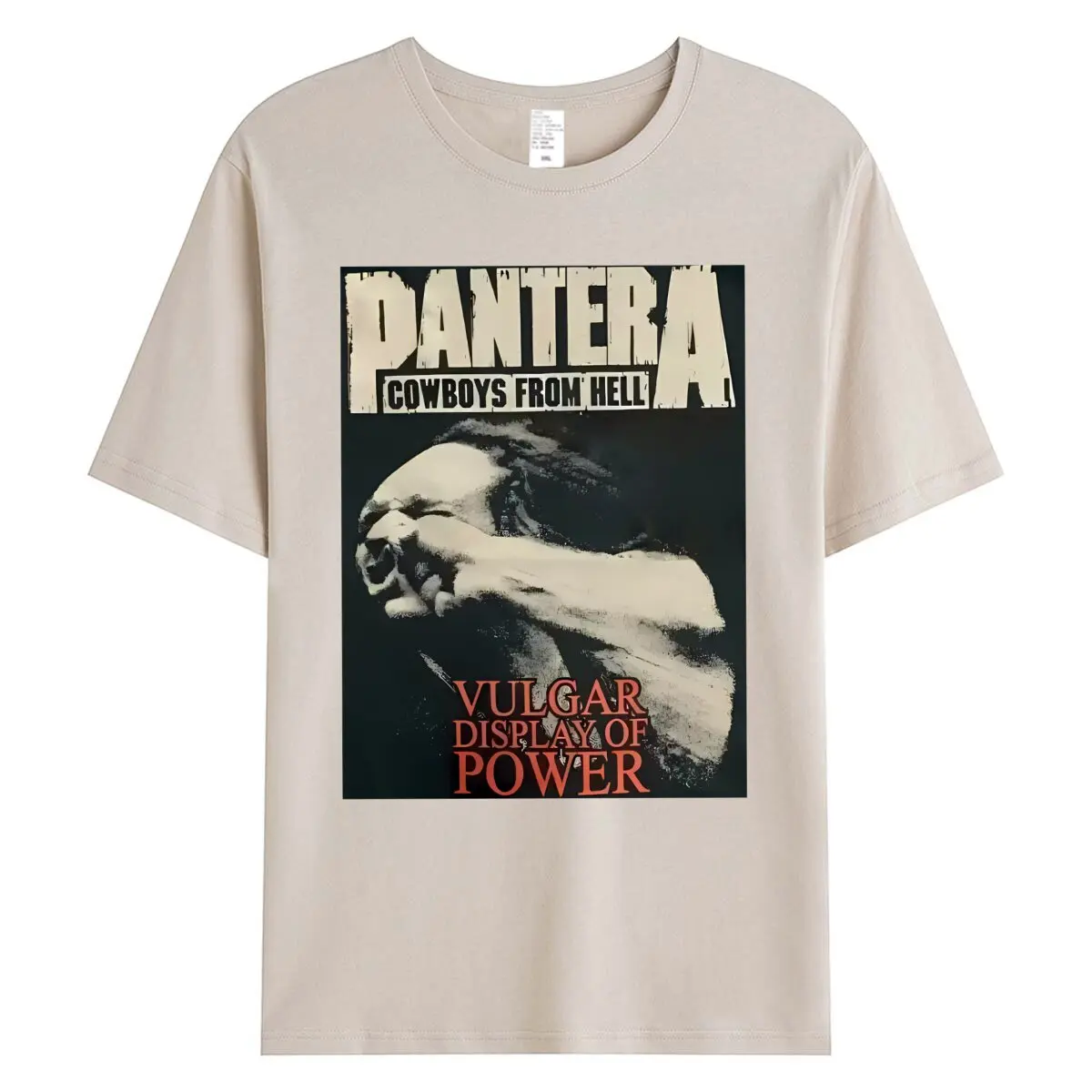Rock your metal passion with this classic Pantera tee featuring the iconic “Cowboys from Hell” artwork. The bold cream-colored band name dominates the chest, while a striking black and white image of raw power dominates the design below. “Vulgar Display of Power” in blood-red text completes this essential piece for any true Pantera fan. This is the kind of shirt that screams metal credibility.