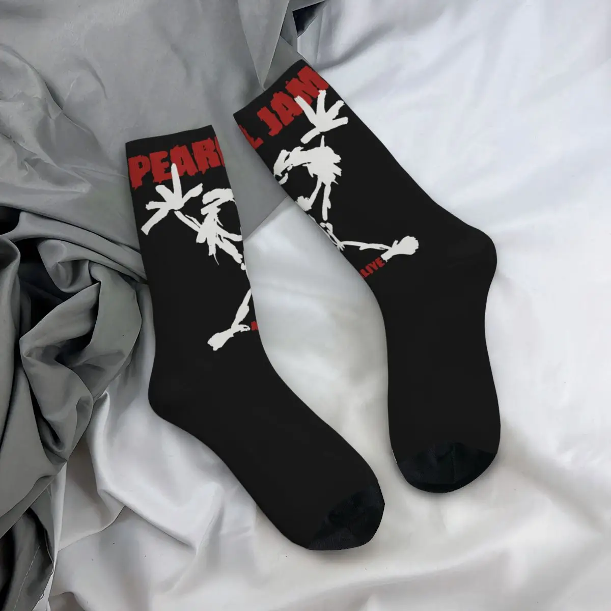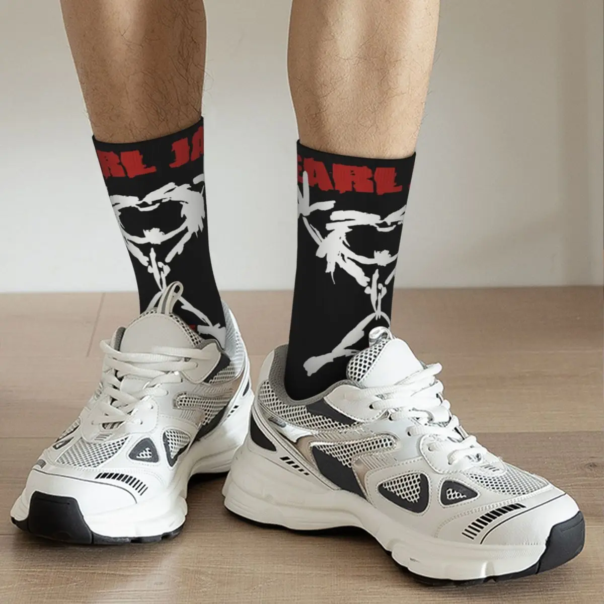 Rock your music taste with these iconic Pearl Jam socks featuring the legendary band’s bold black and red aesthetic. The design showcases striking white silhouettes of the band members against a jet-black background, with the instantly recognizable Pearl Jam text emblazoned across the cuff. Perfect for any grunge fan who wants to wear their fandom straight from the ground up, these socks capture the raw energy and attitude that defined a generation of rock music.