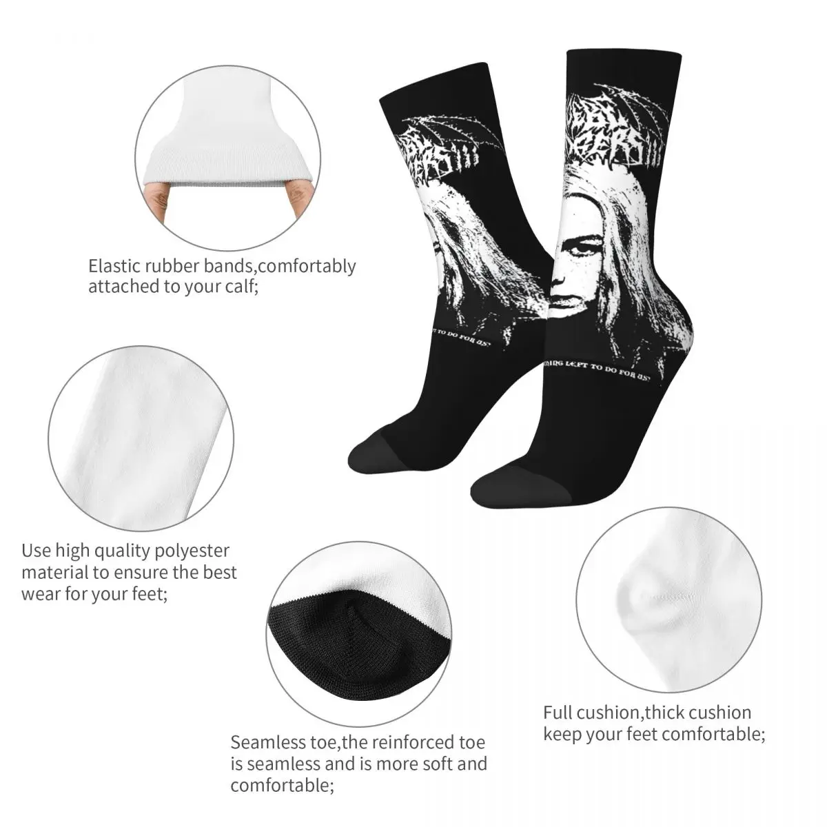 These striking Phoebe Bridgers socks feature a bold black and white portrait design that captures the indie folk artist’s iconic aesthetic. The high-quality graphics showcase her face with intricate detail, crowned with an ethereal crown, creating a haunting and artistic look that any devoted fan will love. With the mysterious text woven into the design, these socks are a perfect way to rep your favorite artist while keeping your feet cozy and stylish.