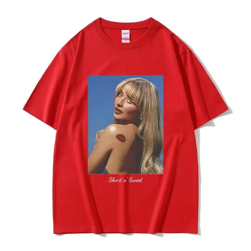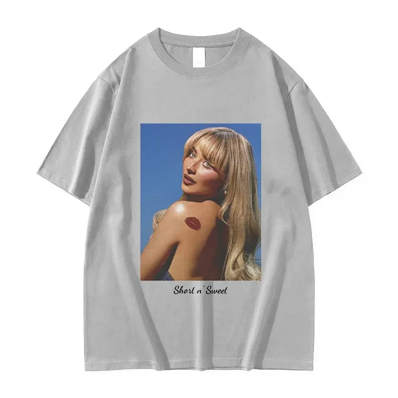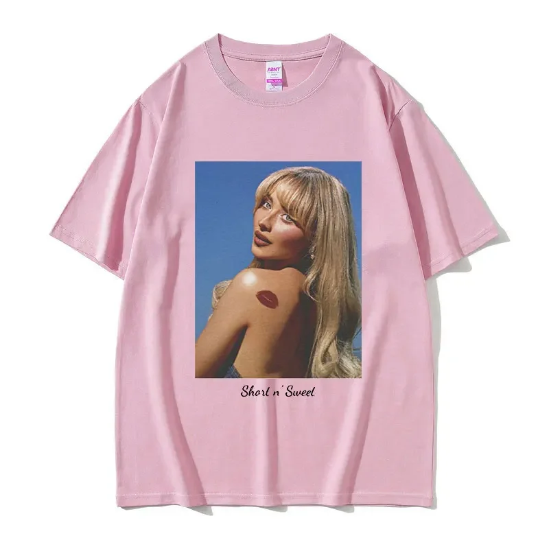 Rock Sabrina Carpenter’s iconic aesthetic with this Short N’ Sweet track tee! Featuring a stunning portrait of the pop star against a vibrant blue background, this white t-shirt captures the sweet and sultry vibe of her latest era. The “Short n’ Sweet” text below the image makes it an instant essential for any Sabrina fan. Perfect for showing your love for one of pop’s biggest talents.