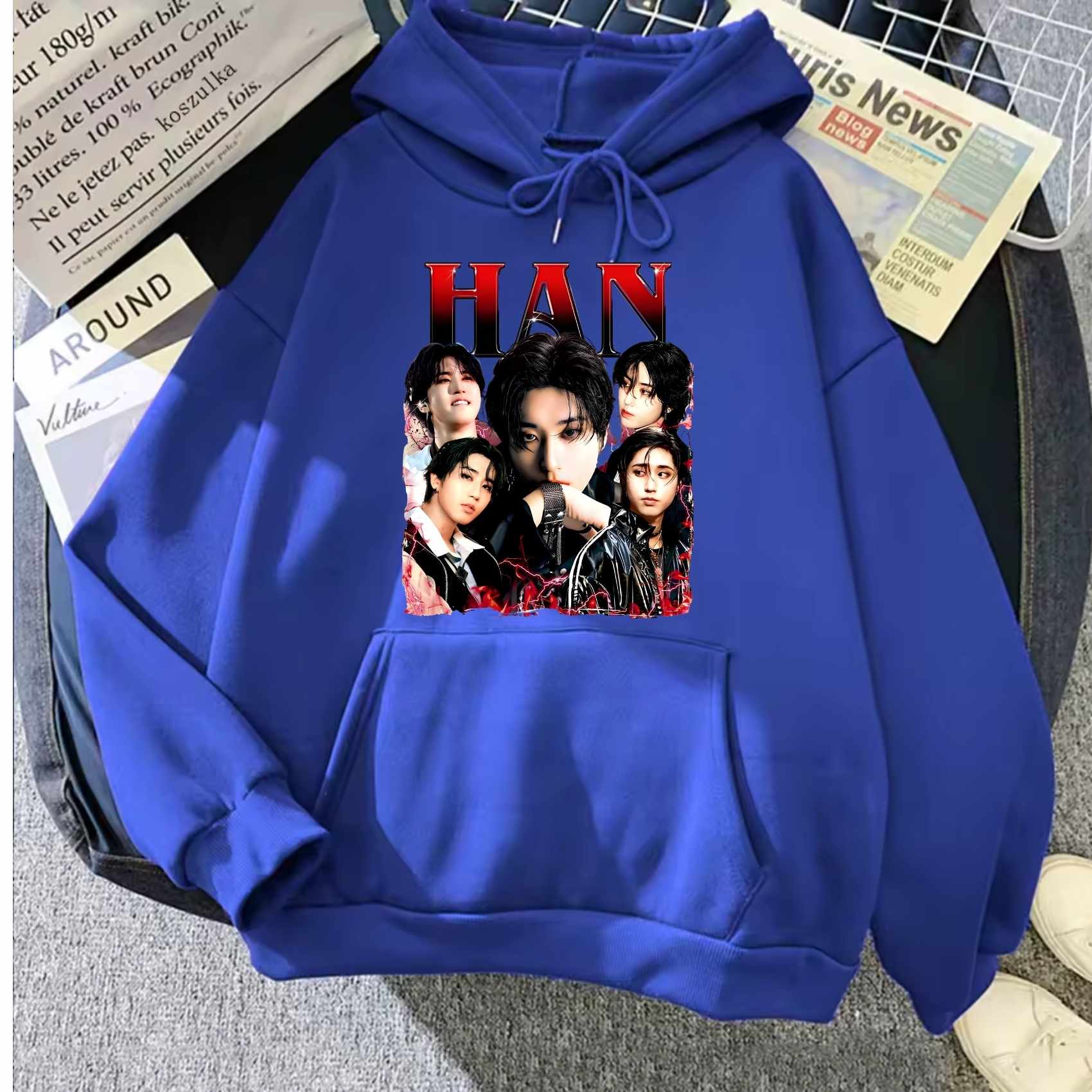 - Streetwear & Graphic Focus: Reflecting Han’s bold, modern style, hoodies frequently feature vibrant graphic prints, patchwork details, or an oversized fit, combining comfort with a distinct hip-hop aesthetic.
