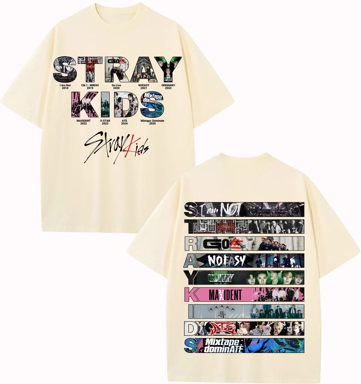 This design is a tribute to STRAY KIDS’ bold discography — with album visuals and references printed in a clean, striking layout. Whether you’re a fan of their early chaos or recent maturity, this tee covers it all, celebrating Bang Chan, Lee Know, Changbin, Hyunjin, Han, Felix, Seungmin, and I.N.