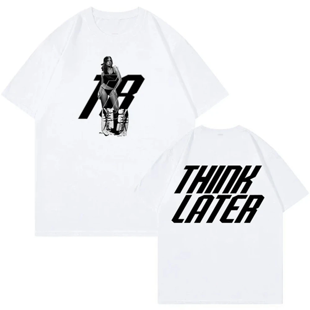 • Trendy Graphic Design: Features the bold “Think Later” slogan, highlighting Tate’s pop queen status.